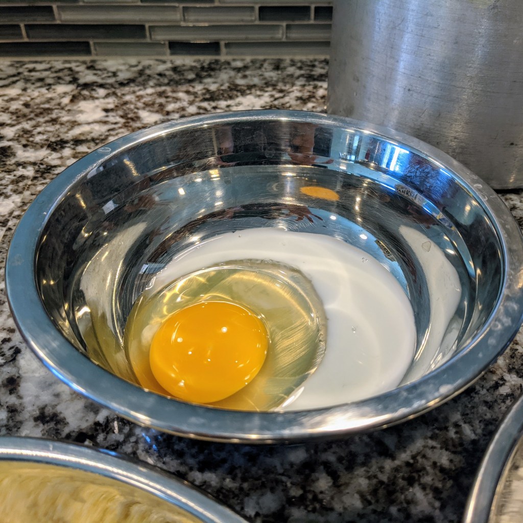 In the 3rd bowl, add eggs, milk, and beat well.