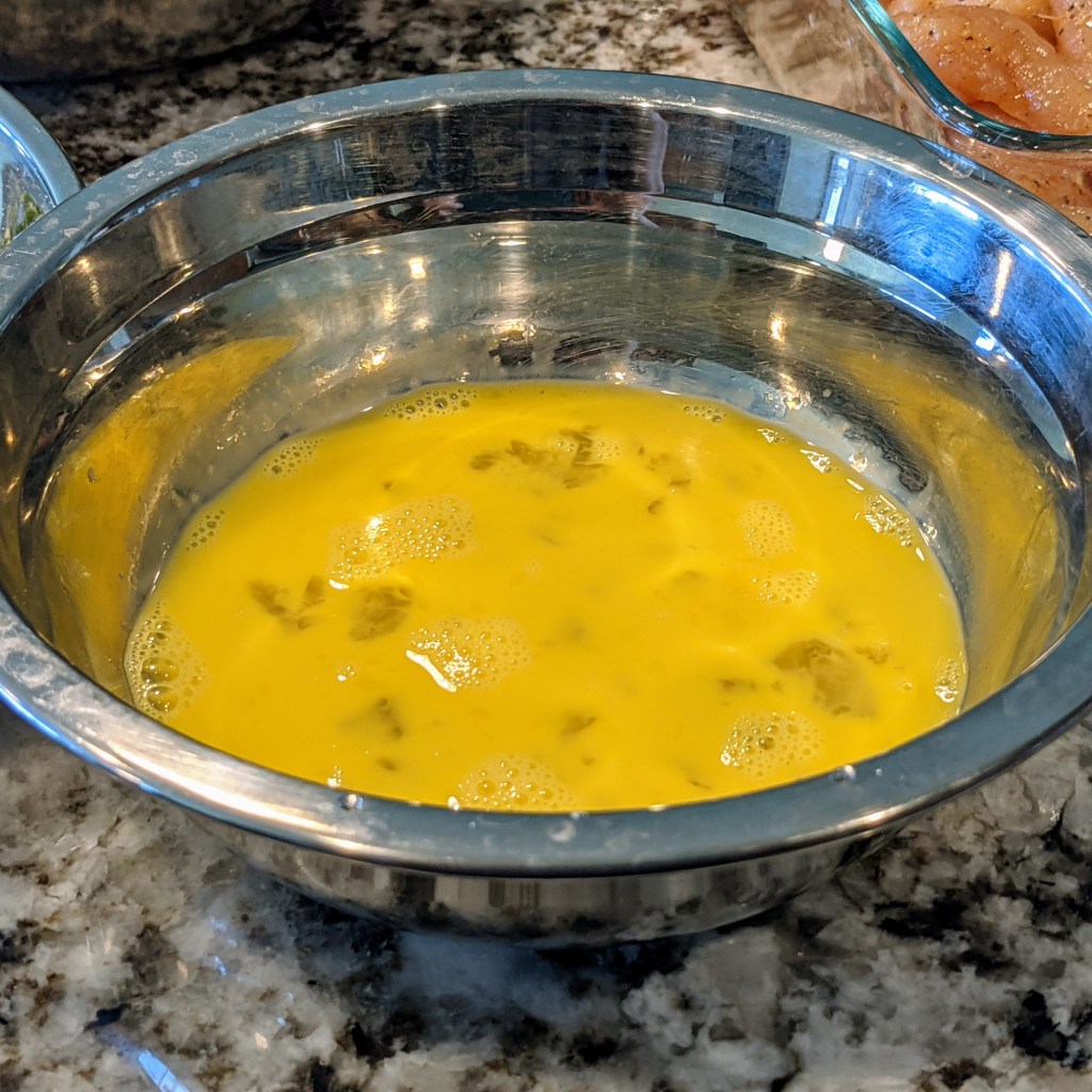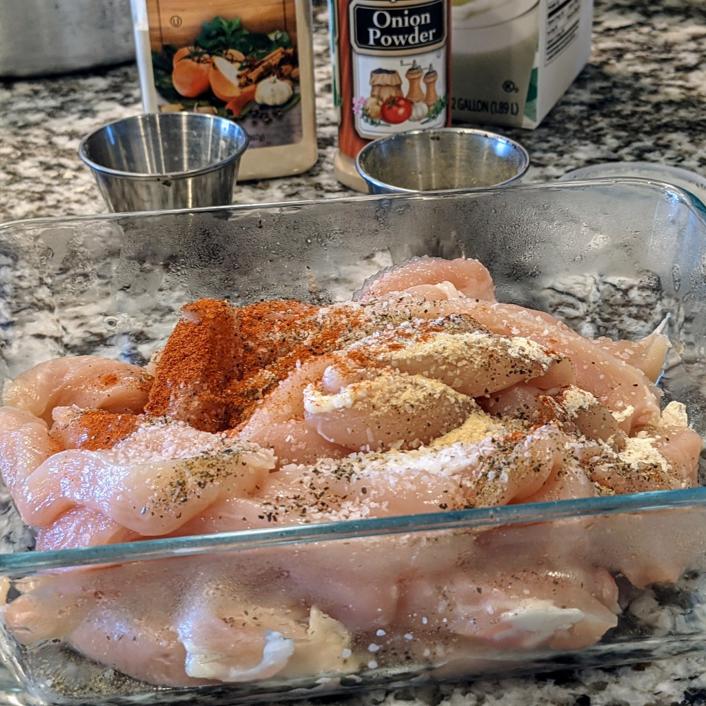 Place chicken strips in a large shallow bowl with all the spices. Gently mix in all the spices well into the chicken and set aside while you set up the breading station.