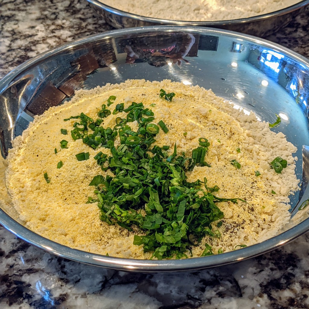 In the 2nd medium bowl, add panko, cornmeal, salt, pepper, parsley, and chives, and mix.