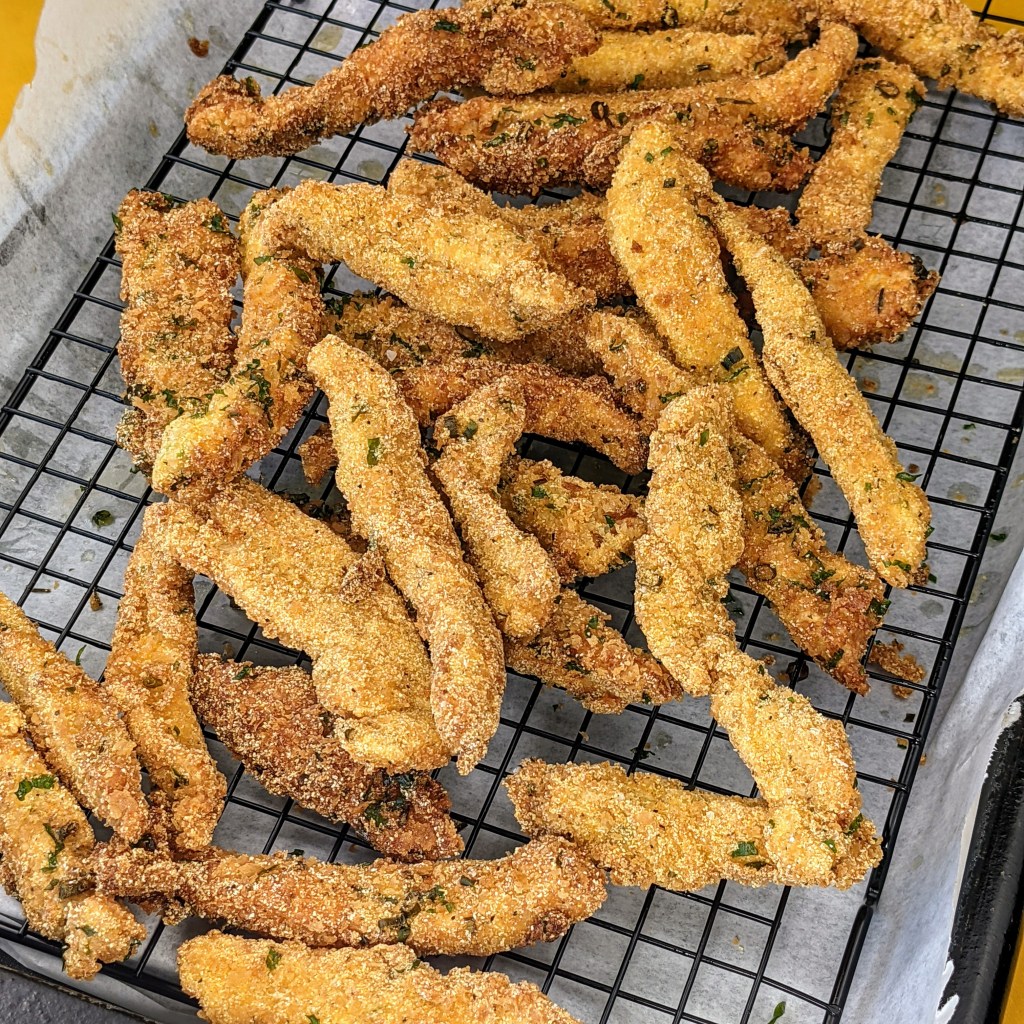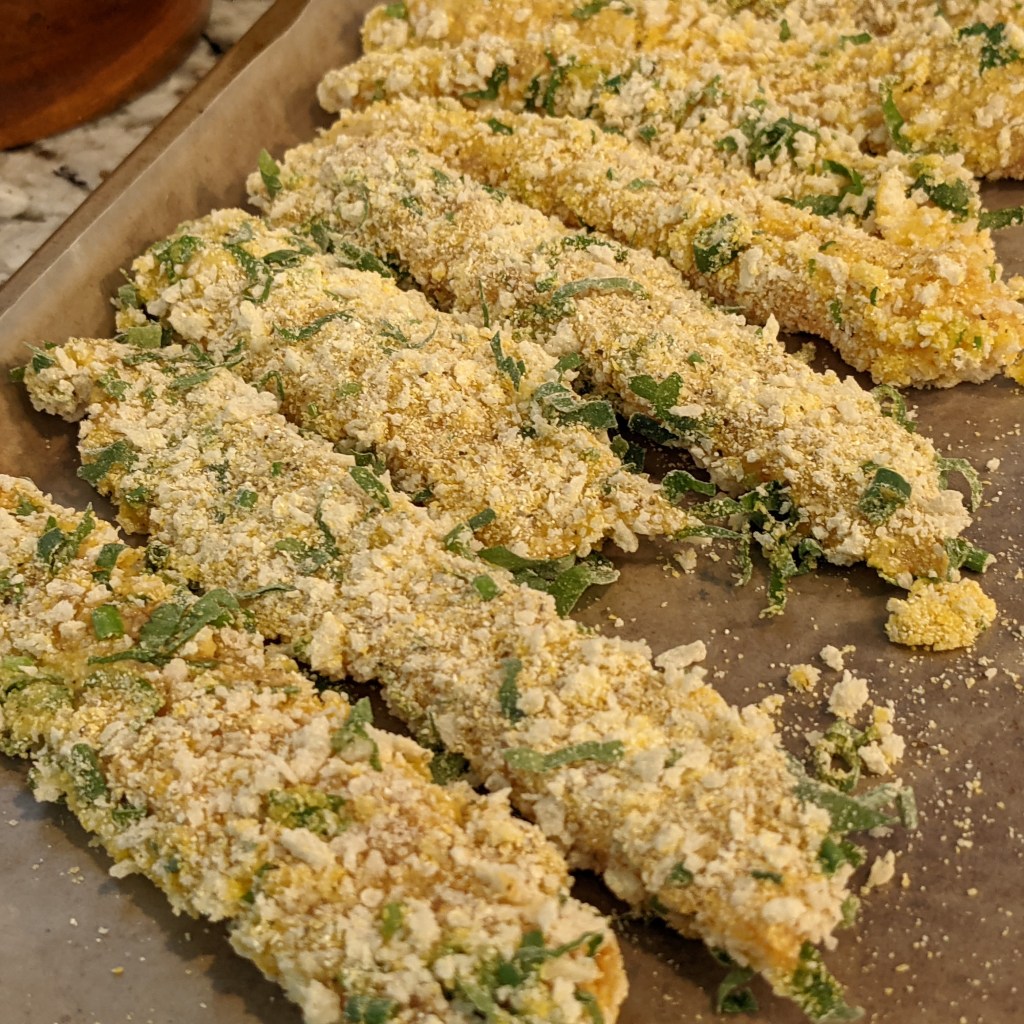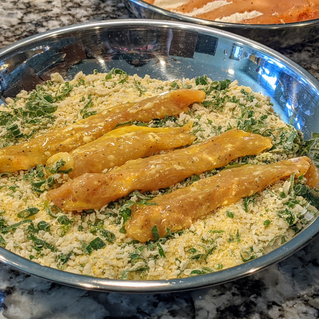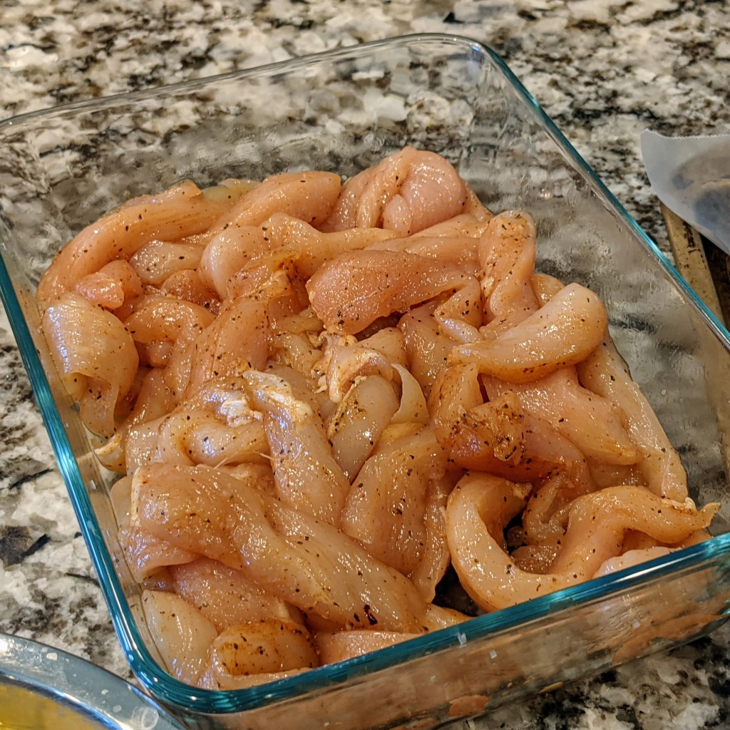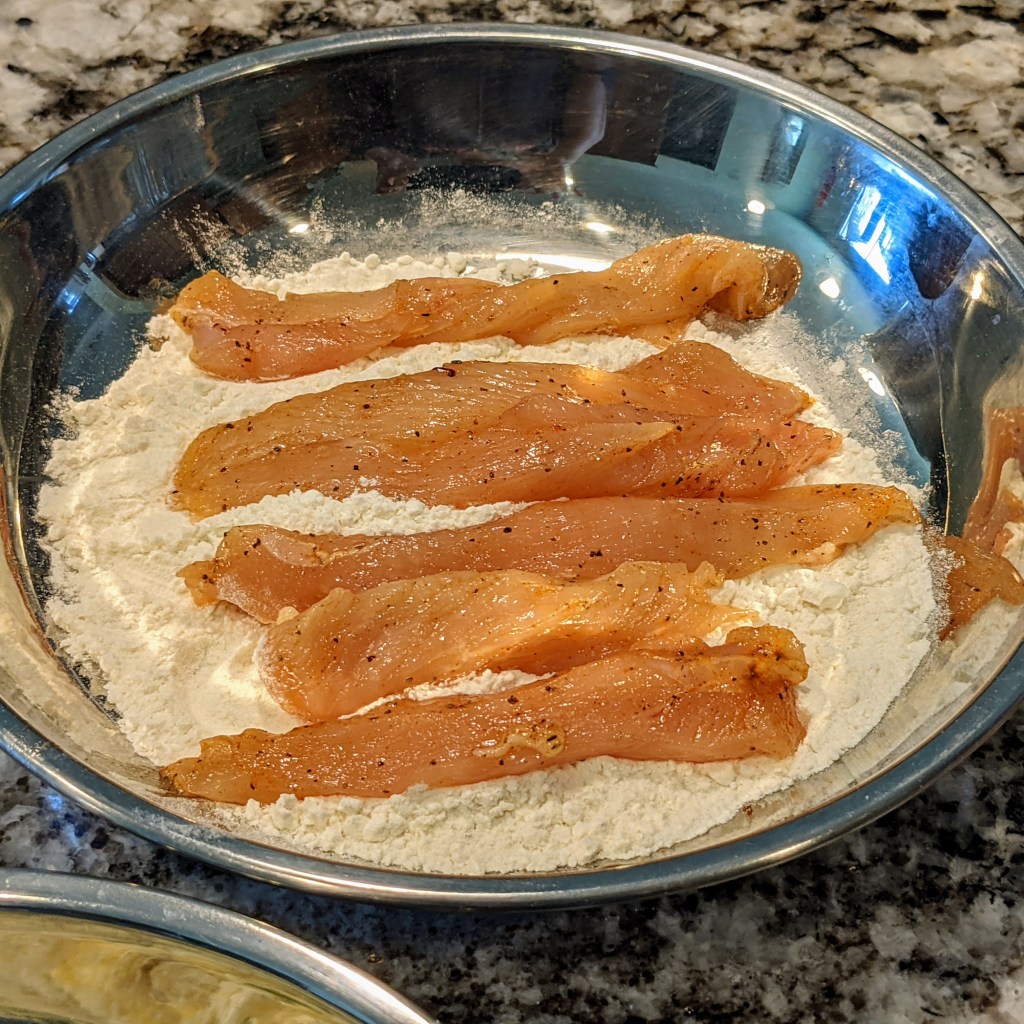 - 3 large chicken breast or (1.5 to 2 lbs.) cut into 4-inch long, 1/2-inch thick pieces
