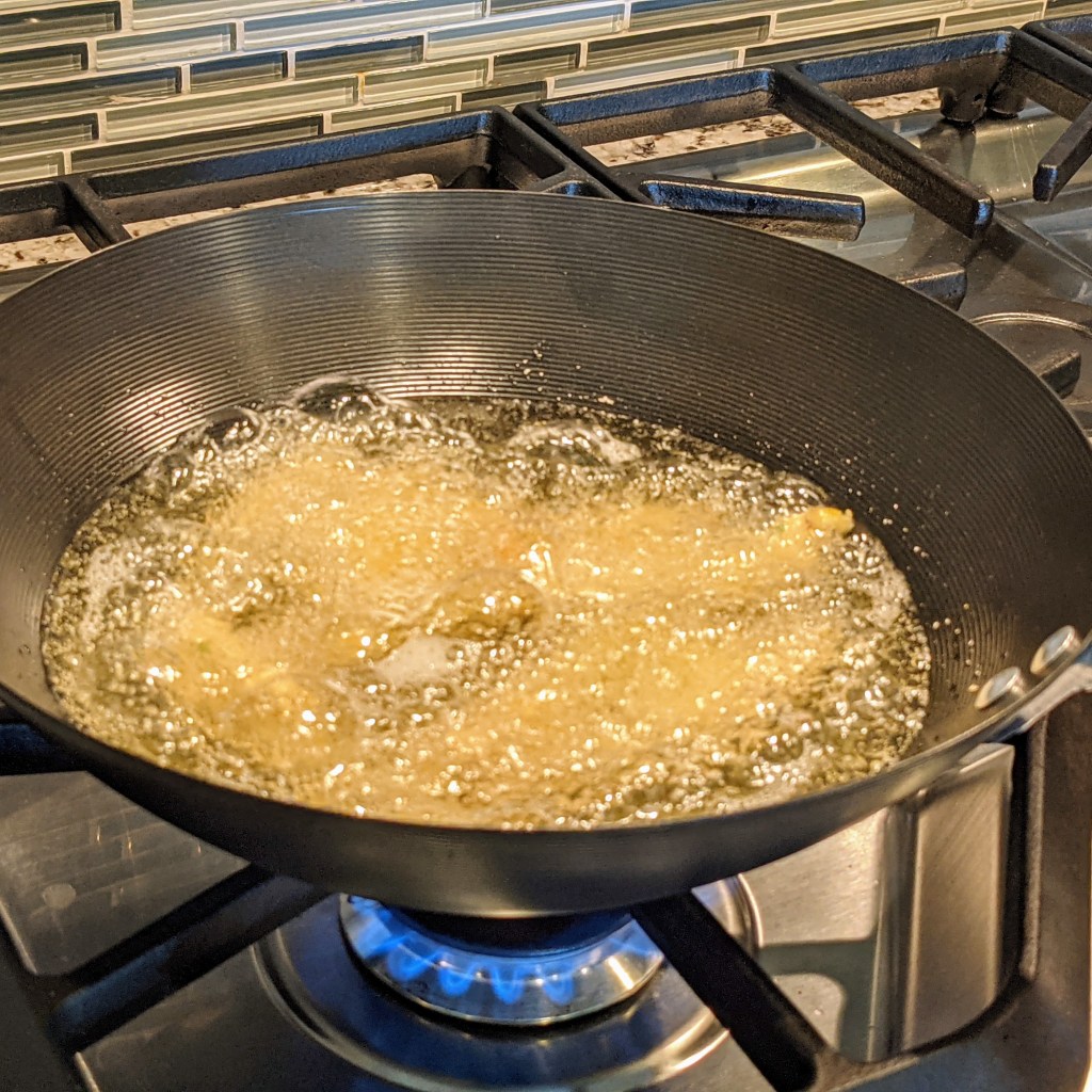 I like to fry my chicken fries in a medium-size non-stick wok. This uses little oil than a regular pan, although that would work too. A trick for a good fried product is to not overcrowd the pan during frying, and maintaining the correct temperature (350-375 degrees).