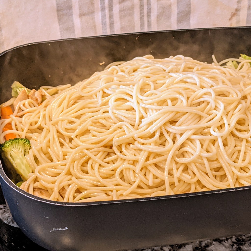 I was able to use some spaghetti noodles I had in my pantry, and also used chicken breast, broccoli, cabbage, and carrots to make my noodle stir-fry. You could also use shrimp, pork, or whatever you have on hand. If you want vegetarian you can use tofu and also change the oyster sauce to a vegetarian mushroom oyster sauce.