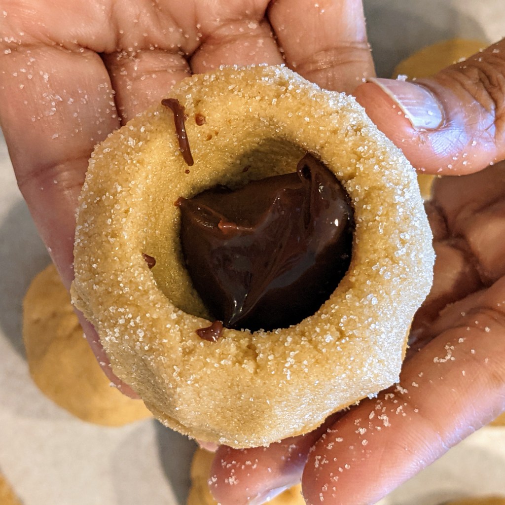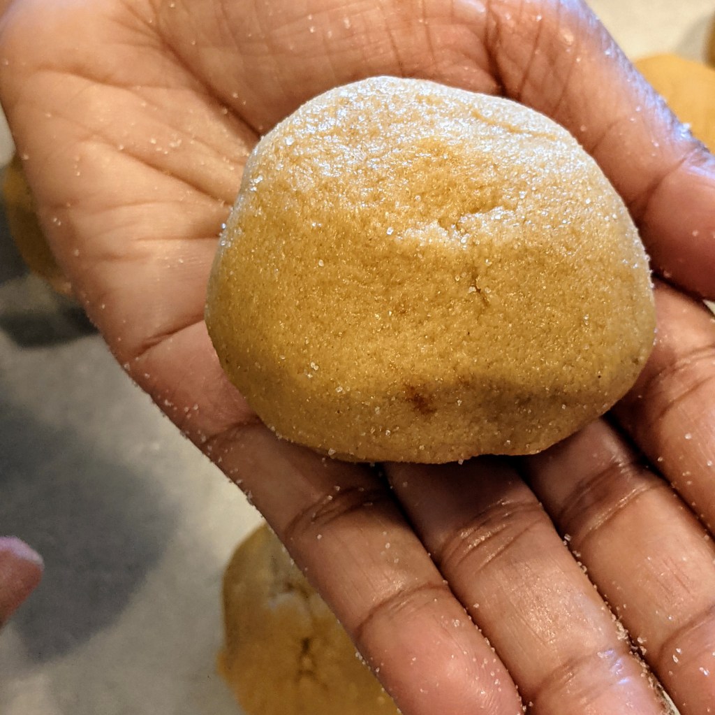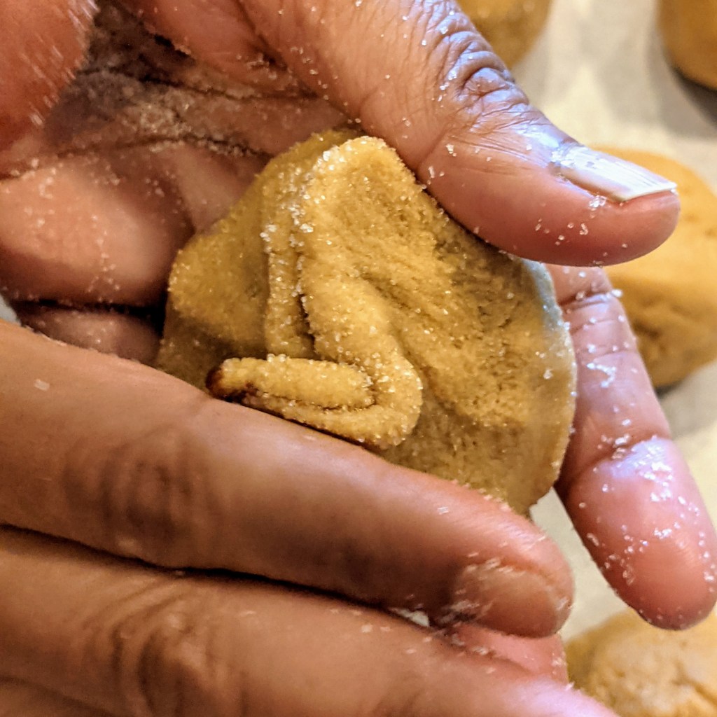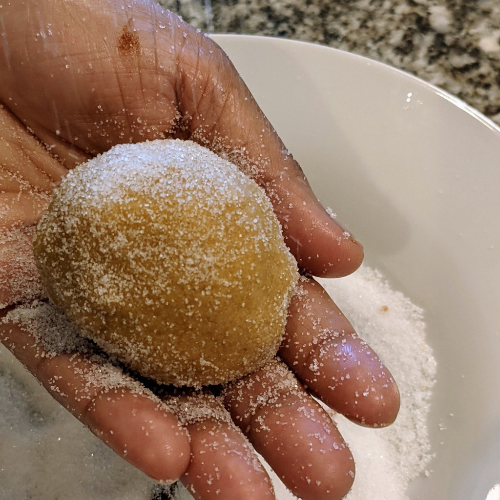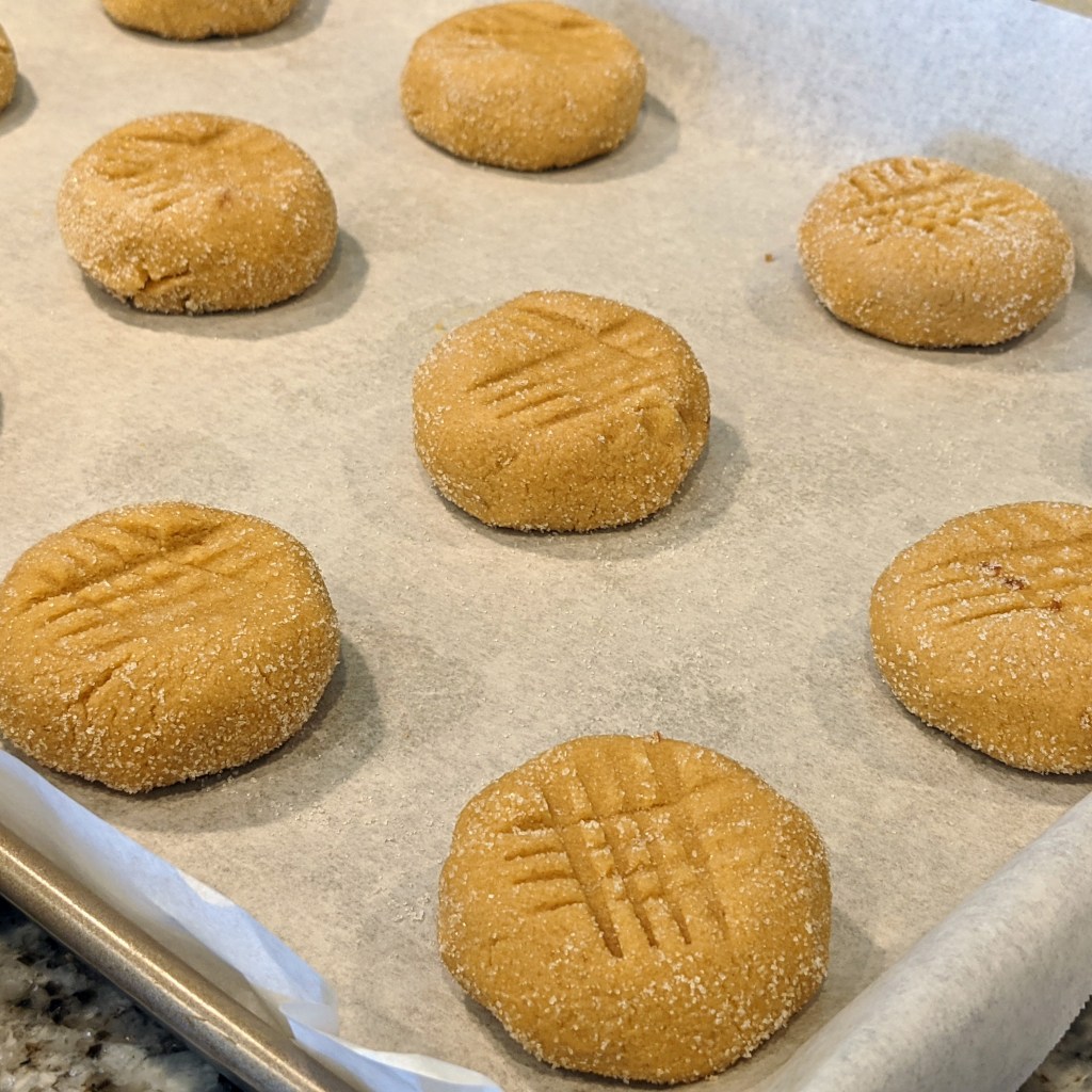 Roll the ball gently in the granulated sugar. Place balls on baking sheets lined with parchment paper. Flatten by crisscrossing with the tines of a fork, try to be careful so the cookie doesn’t crack.
