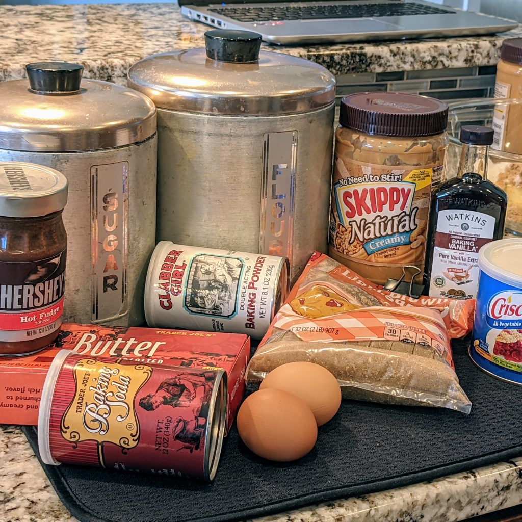 The base for the peanut butter cookies came from the “Better Homes and Gardens” cookbook. I like my cookies a bit soft in the middle and slightly crunchy around the edges. The trick to getting that effect is to add a small amount of margarine to the mix. What really makes these peanut butter cookies special, however, is the Hersey’s hot fudge topping.