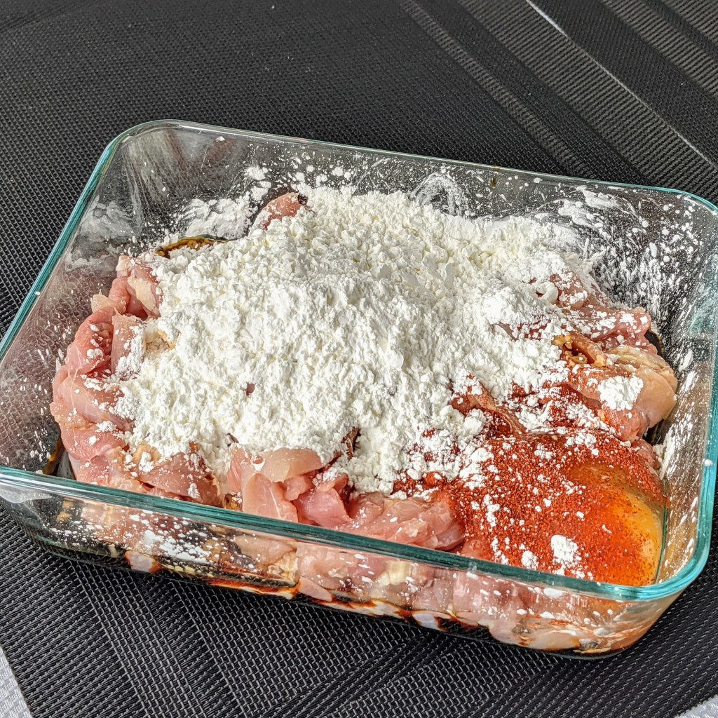 In a medium shallow baking dish place chicken, soy sauce, beaten egg, water, cornstarch, and black pepper. Use a clean hands to mix all the ingredients well. Make sure not to have any cornstarch clumps. Add another tbsp. of water if needed, then set aside.