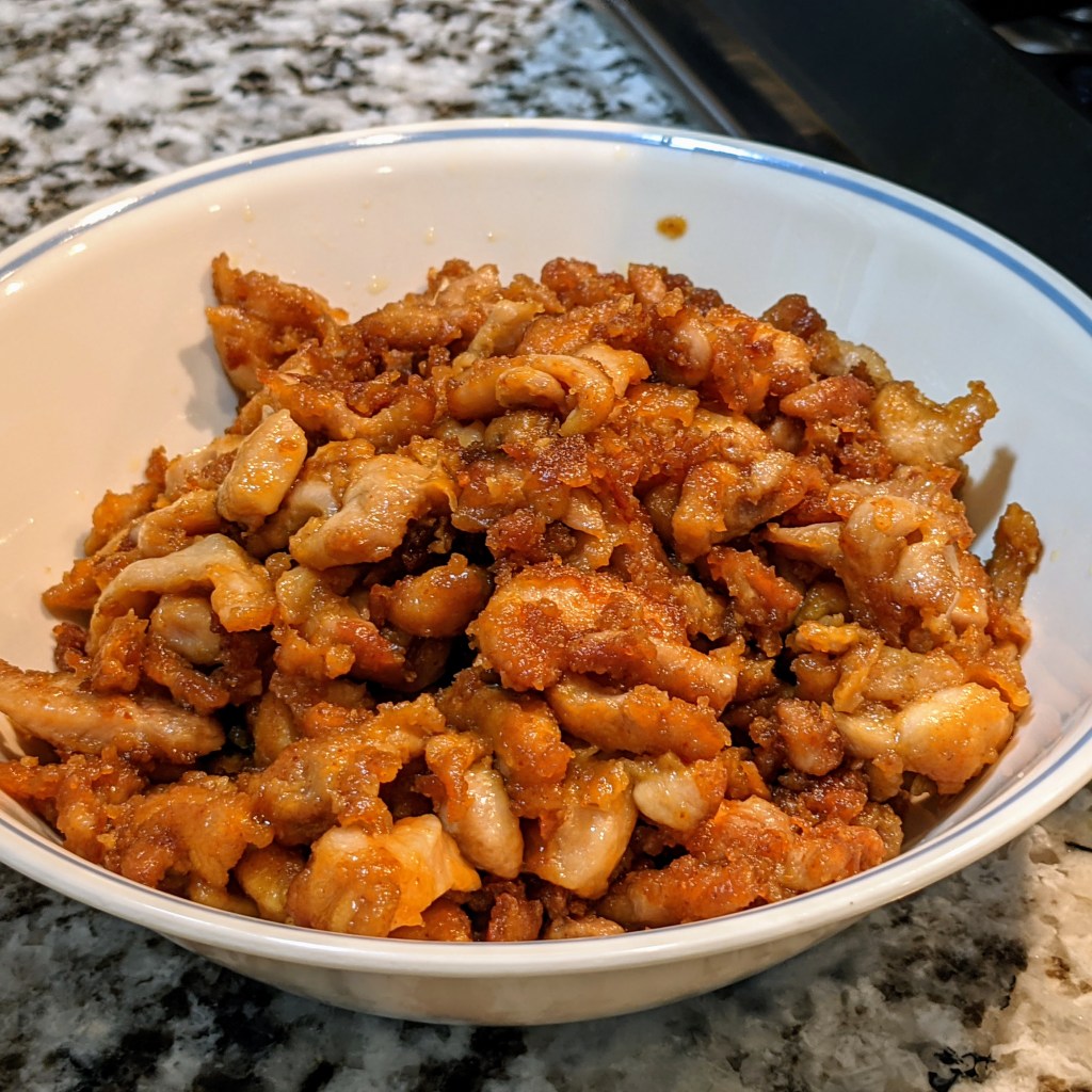Heat oil in a large non-stick wok over medium heat. When hot, add marinated chicken, spreading it into thin layer as much as possible. Cook the chicken undisturbed for a minute or two. We want slight crust on the chicken. Once you see that chicken has browned a bit, stir the chicken and break up the pieces, if stuck together. Cook the chicken for 6-8 minutes or until cooked trough. Remove the chicken to a bowl or plate with a slotted spoon, leaving the oil in wok.