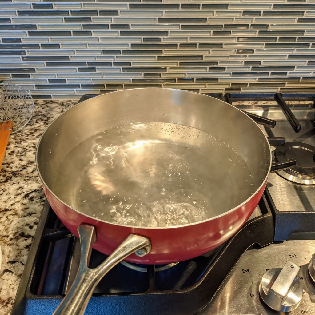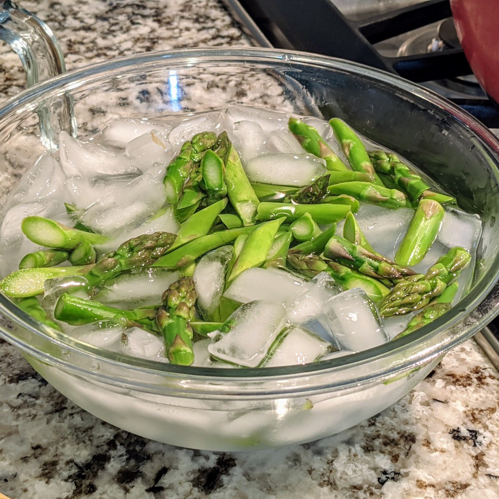 Bring 8 cups of water and 1 1/2 tbsp. of salt to a rolling boil. Cooked the asparagus for minute and a half in a boiling water. After minute and a half, remove the asparagus and place it in an ice-bath. Make sure the asparagus are submerged in water. This process keeps the asparagus lush green and prevents it from over cooking.