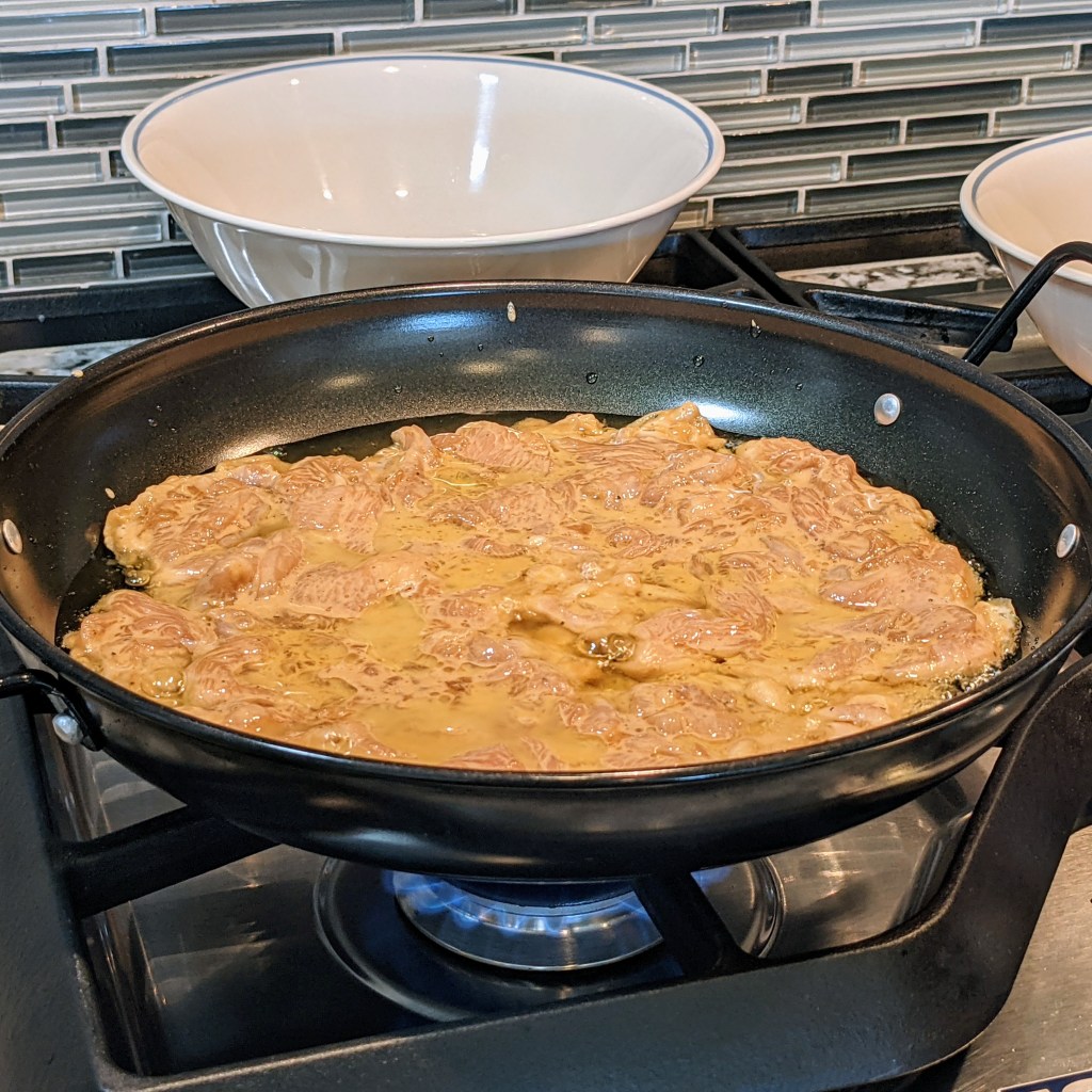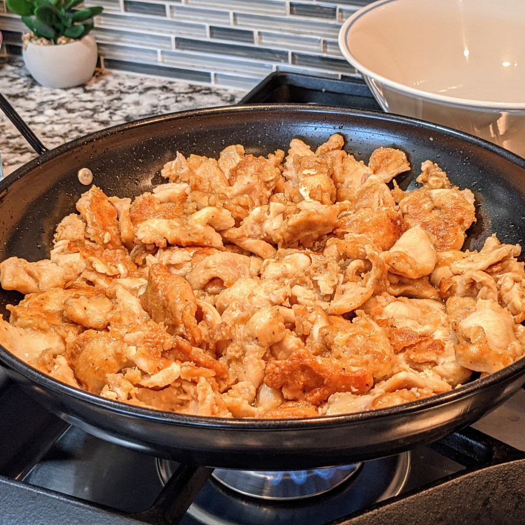 I like to use a large wok for my stir fry where I can cook all my chicken in one batch. If you don’t have a large wok, you can use a non-stick wide-mouth pan or just cook the chicken in small batches. It’s important to make sure you don’t overcrowd the pan when you cook chicken for stir fry. You want the chicken to have a golden brown crust.