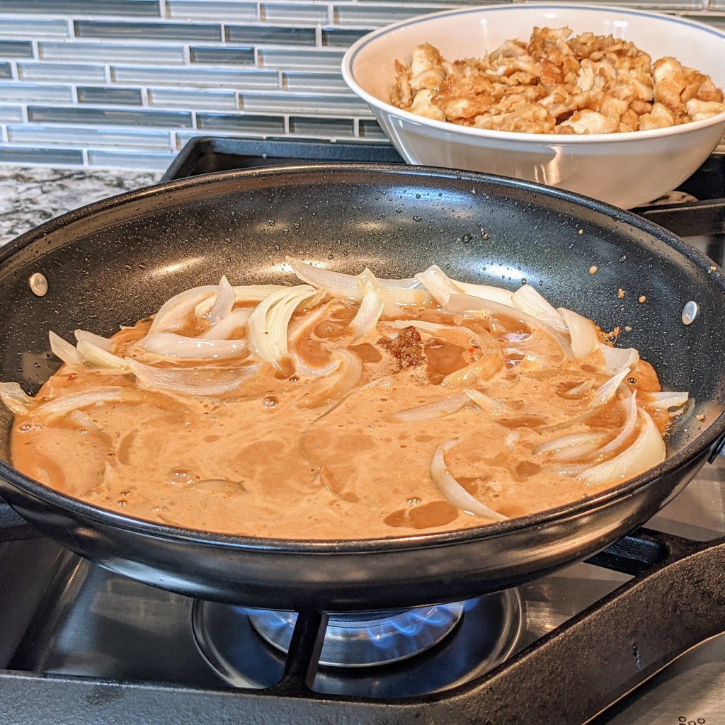 Turn the heat up to medium-high, then add the onions, cook for 2 minutes, then add the stir-fry sauce. Cook for another minute or two.
