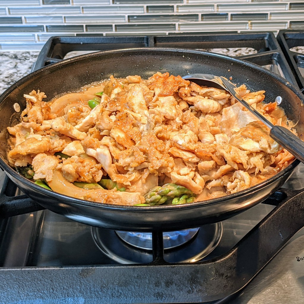 Next add the cooked chicken and asparagus. Gently mix in with the sauce, cook until just warmed through. Off heat toss in the green onions.