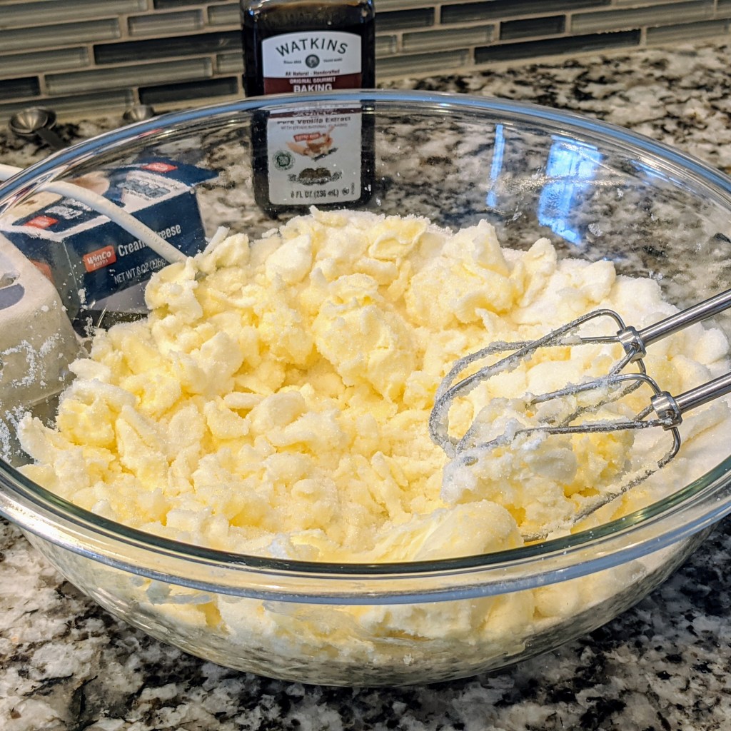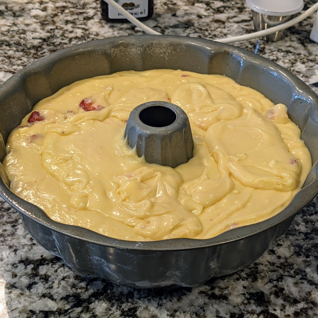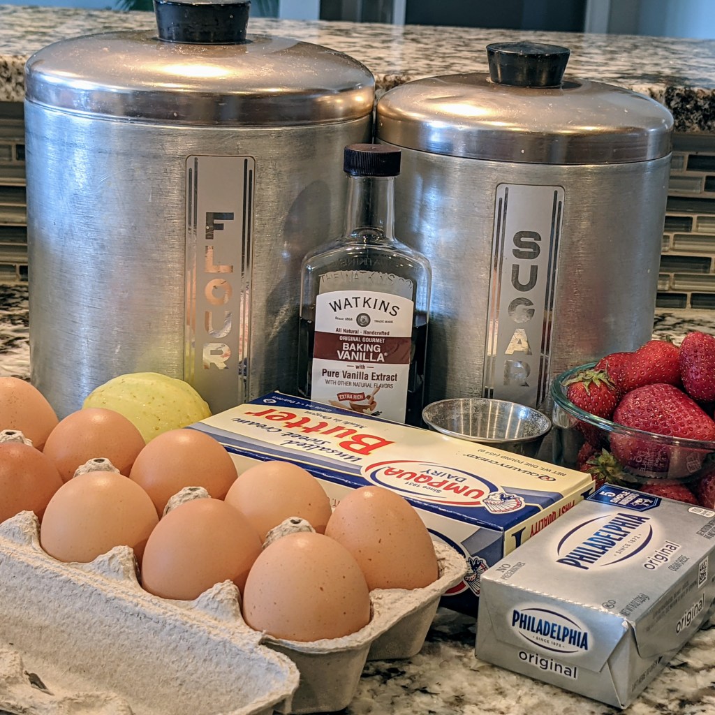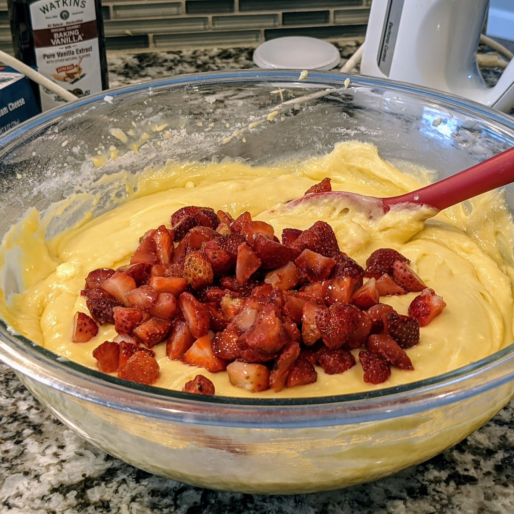 Since I had cream cheese in the refrigerator, I decided to use it up and try to make a cream cheese pound cake. I searched my pile of cookbooks and the internet for the best cream cheese pound cake. One that resonated with me was from the Allrecipes website. I made and tweaked it several times to figure out how to best proportion the strawberries and cream cheese.