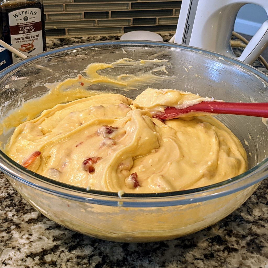 Add flour and mix everything well. Next, gently fold in the diced strawberries.
