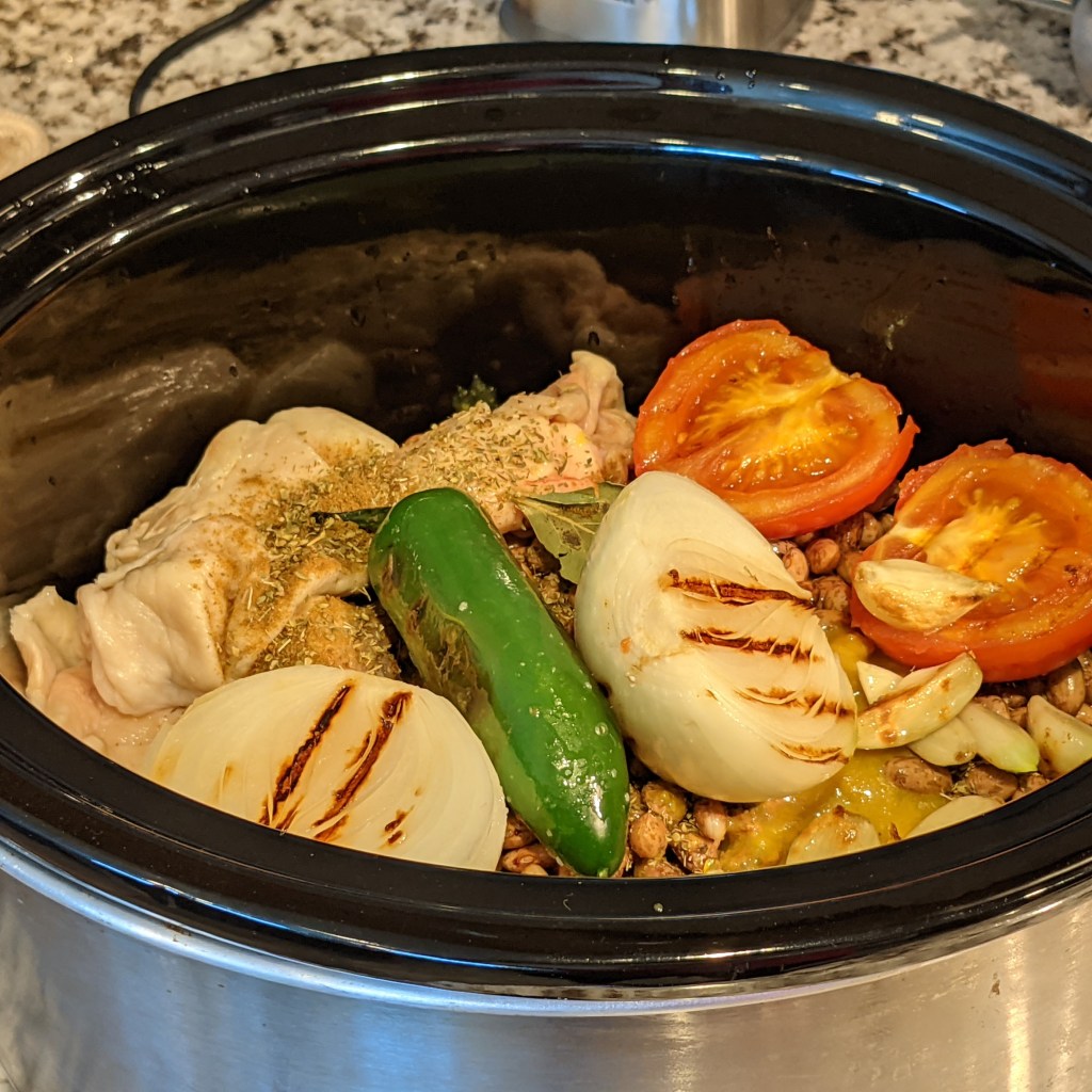 In the meantime, rinse the soaked beans thoroughly, then place it in the slow cooker along with grilled veggies and the rest of the ingredients. Stir well, then cook the beans in high heat for 4 hours, checking and stirring time to time or until beans are cooked. Discard the chicken skins, bay leaves, and jalapeno stem from the beans.