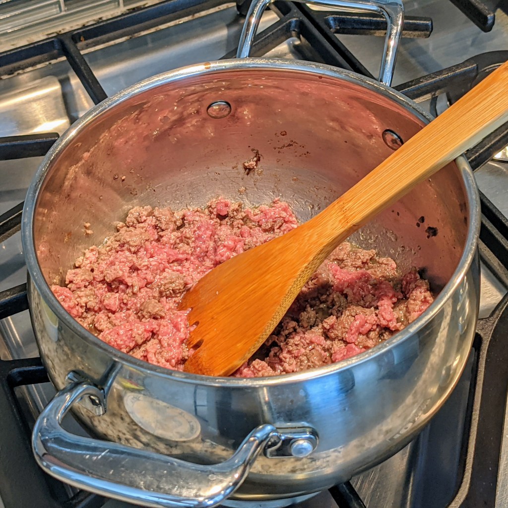 Heat oil in a large, heavy bottom soup pot or Dutch oven. Cook ground beef over medium heat for 5-7 minutes or until the beef is no longer pink. Turn down the heat to low, then remove the beef with a slotted spoon to a plate or a bowl, leaving most of the fat behind.