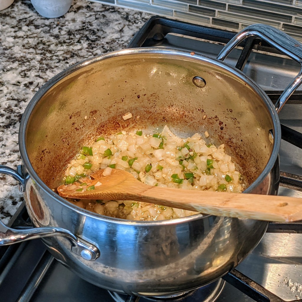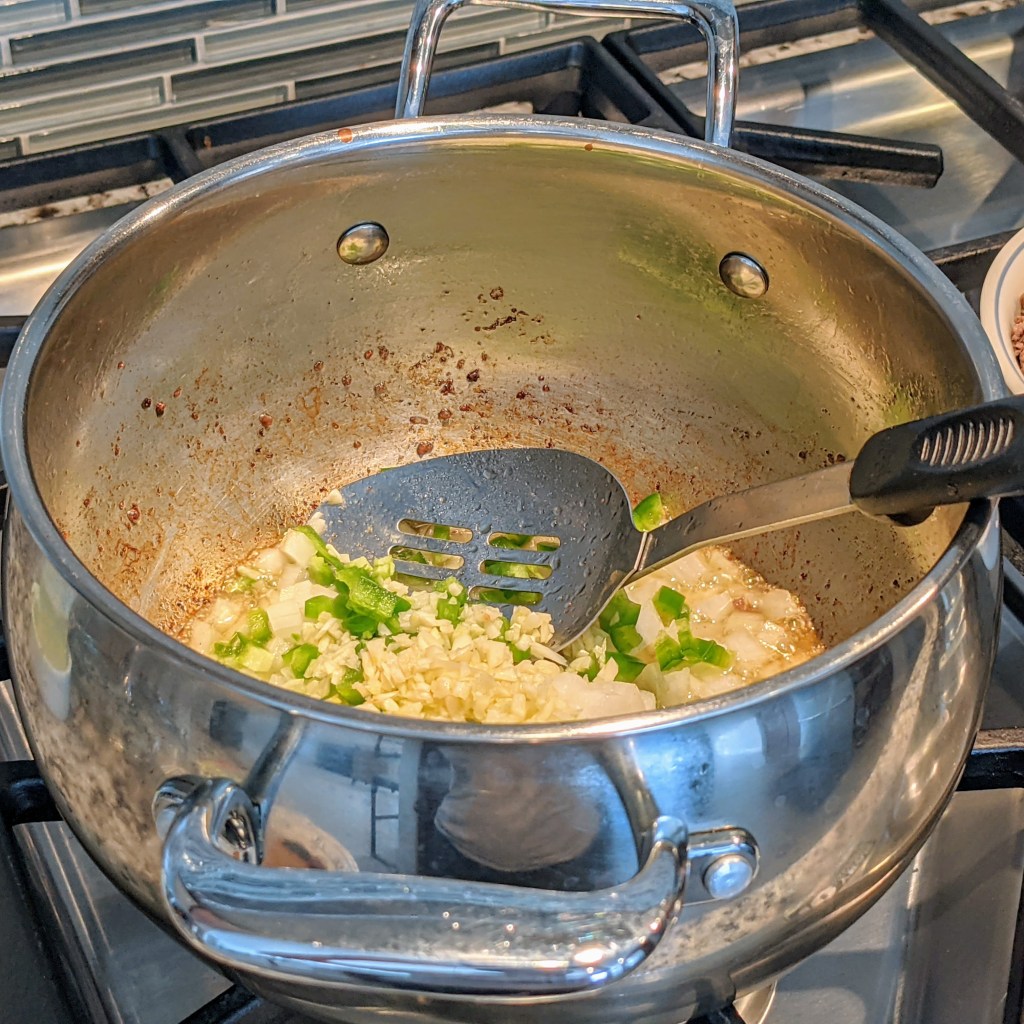 Turn up the heat to medium, then add onion, garlic, and jalapeno to the pan.