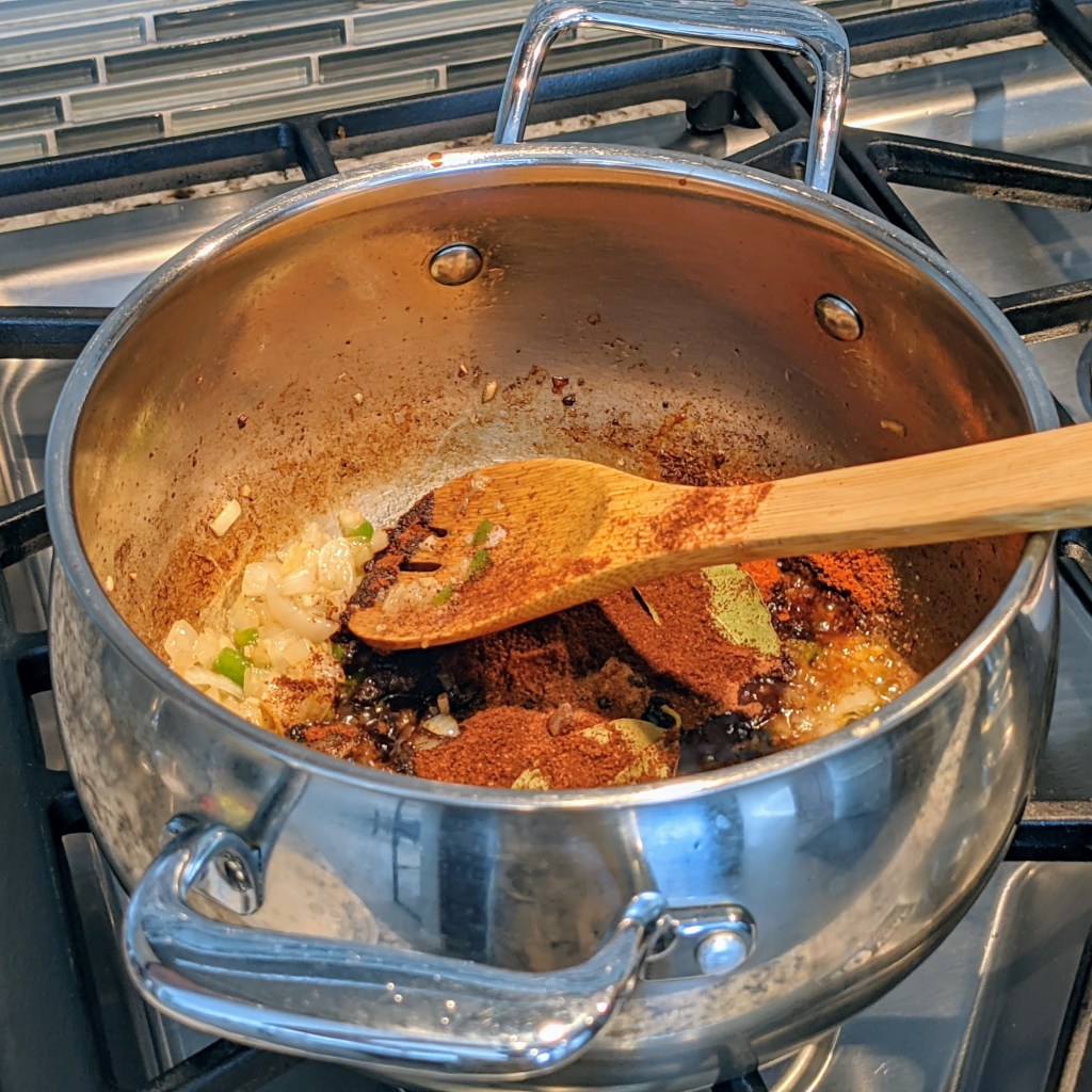 Cook the onion mixture for 3-5 minutes or until onions are soft. Add chili powder, paprika, cumin, salt, cinnamon, cloves, and bay leaves. Turn down the heat to low and cook and stir for 3 minutes more.