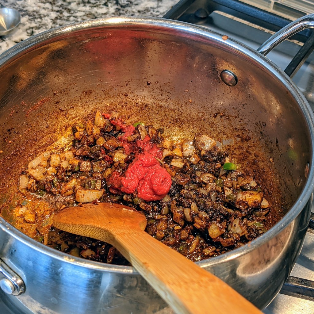 Add tomato paste and cook for a minute. Add canned tomatoes, beef base, water, cooked beef along with all accumulated juices from the bowl to the pan. Stir well.