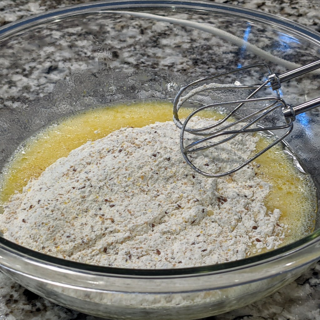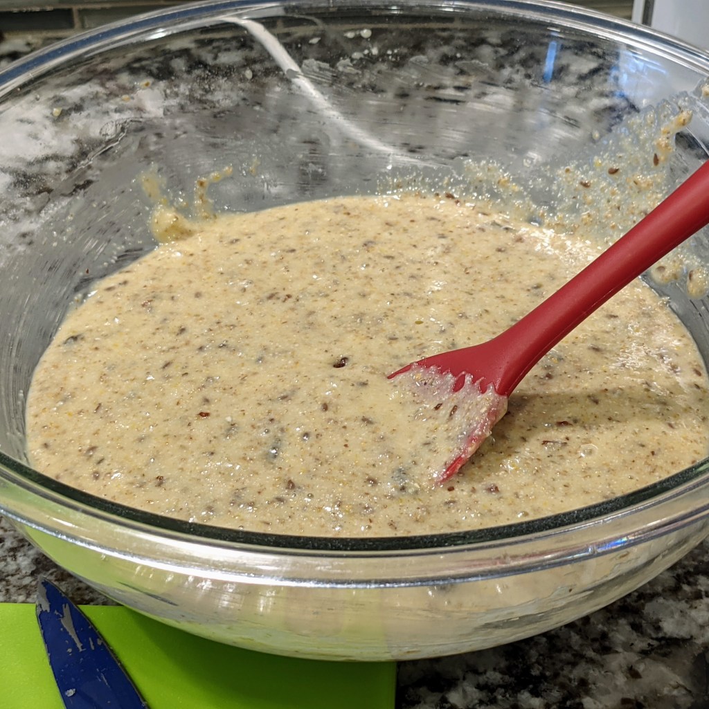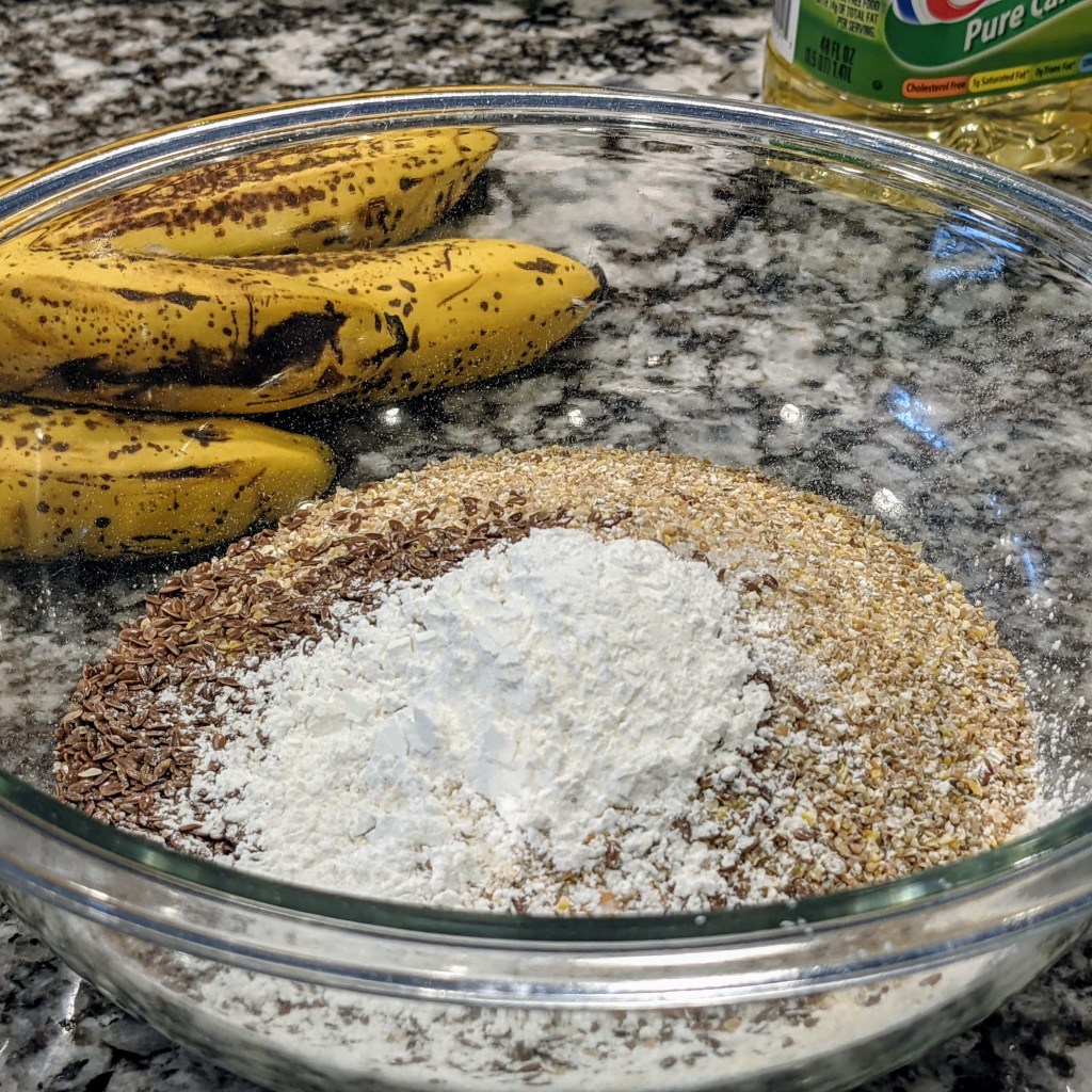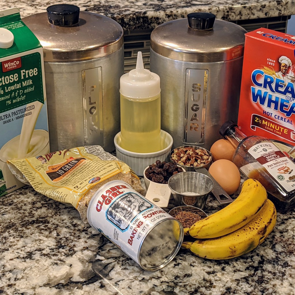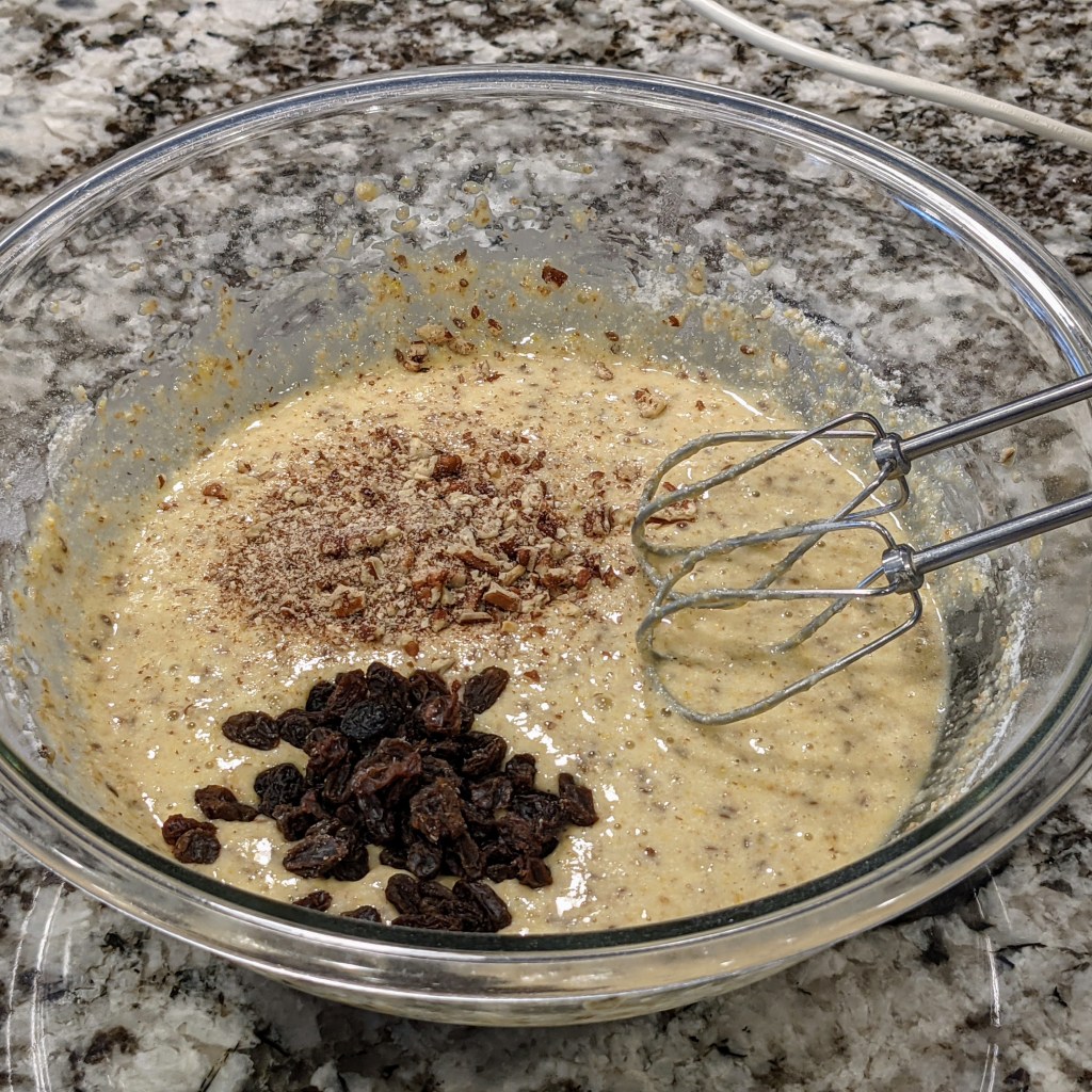 Today’s recipe is the final version of recipes I’ve been trying that use the extra cereal I had on hand. Major ingredients include bananas, pecans (in part since a friend is allergic to walnuts), raisin, flax seed, and a mixture of flour and cereal.