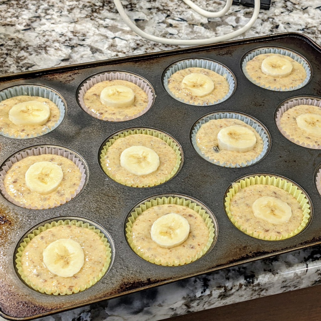 Pour batter into a greased paper lined muffin pan, filling cups 3/4 full. Place one banana slice in the middle of each batter, pressing it gently.