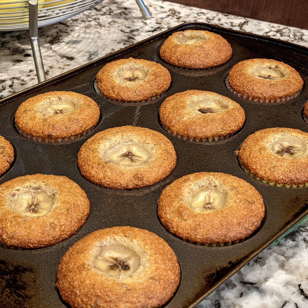 Bake muffins in the preheated oven for 16-20 minutes or until toothpick inserted around the banana slice comes out clean.
