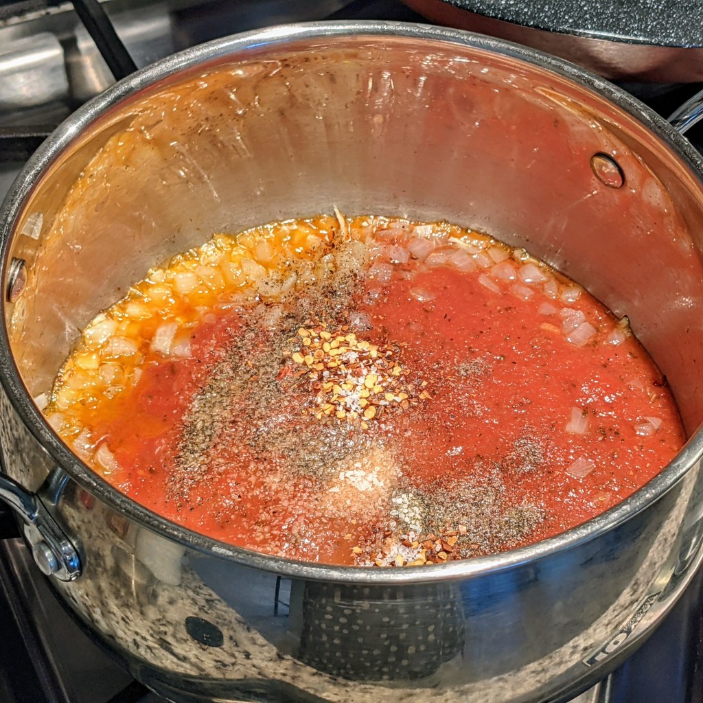 Add pasta sauce, then take 1/4 cup water to rinse the pasta jar. Add rinsed pasta water to the pot along with chili flakes, sugar, salt, pepper. Stir well, then cover and cook for 8-10 minutes, stirring a few times in between.