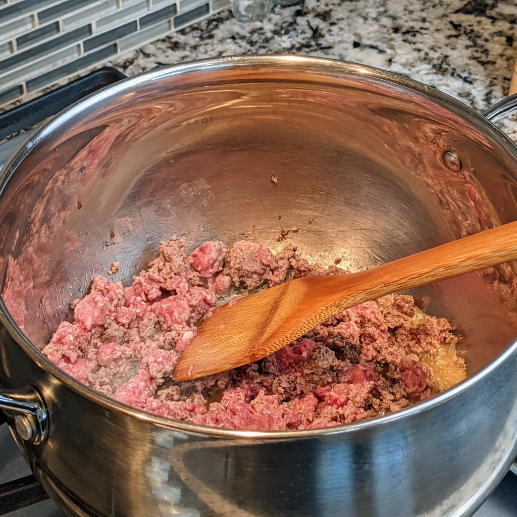 Heat a large heavy bottom sauce pan over medium-high heat. Add ground beef, breaking into small pieces. Cook the beef for 4-5 minutes, stirring and breaking the large pieces.