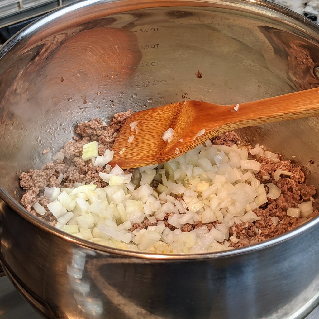 Add onion and garlic to the beef, cook for another 3-5 minutes or until onions are soft.