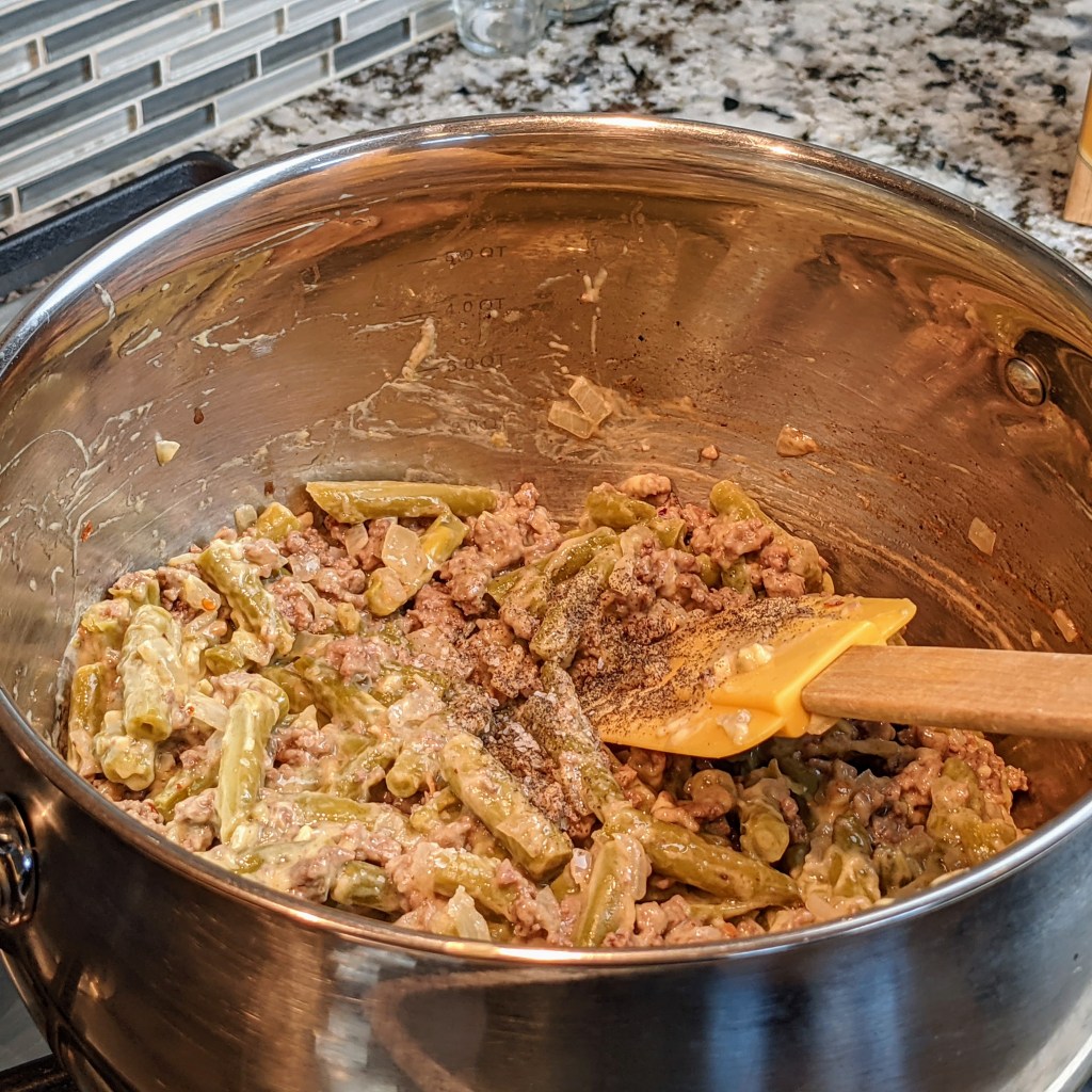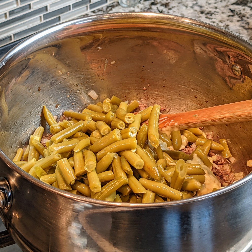 Turn down the heat to very low, the add the onion soup mix, celery soup, salt, pepper, and drained beans. Gently stir all ingredients well. Turn off the heat.