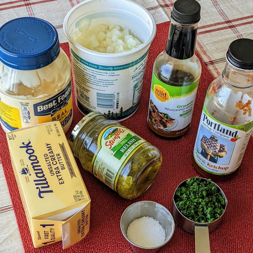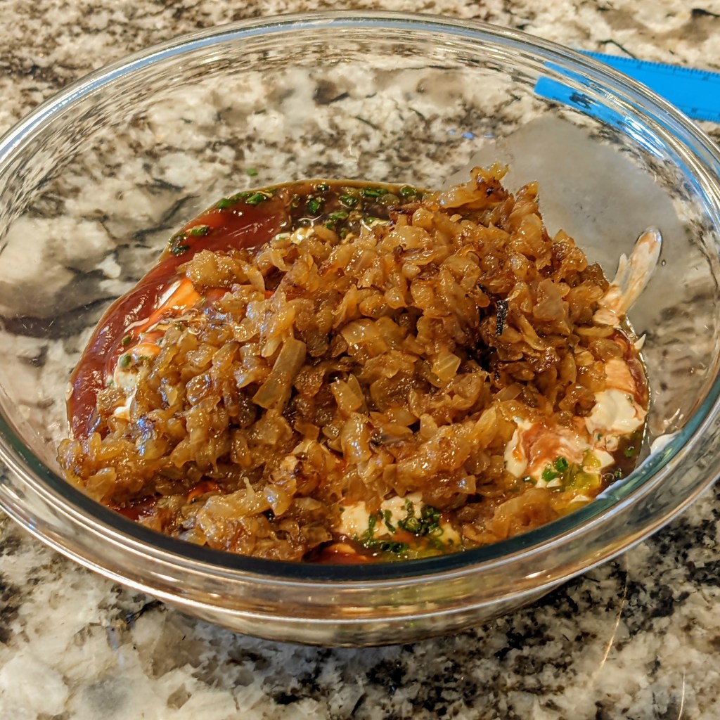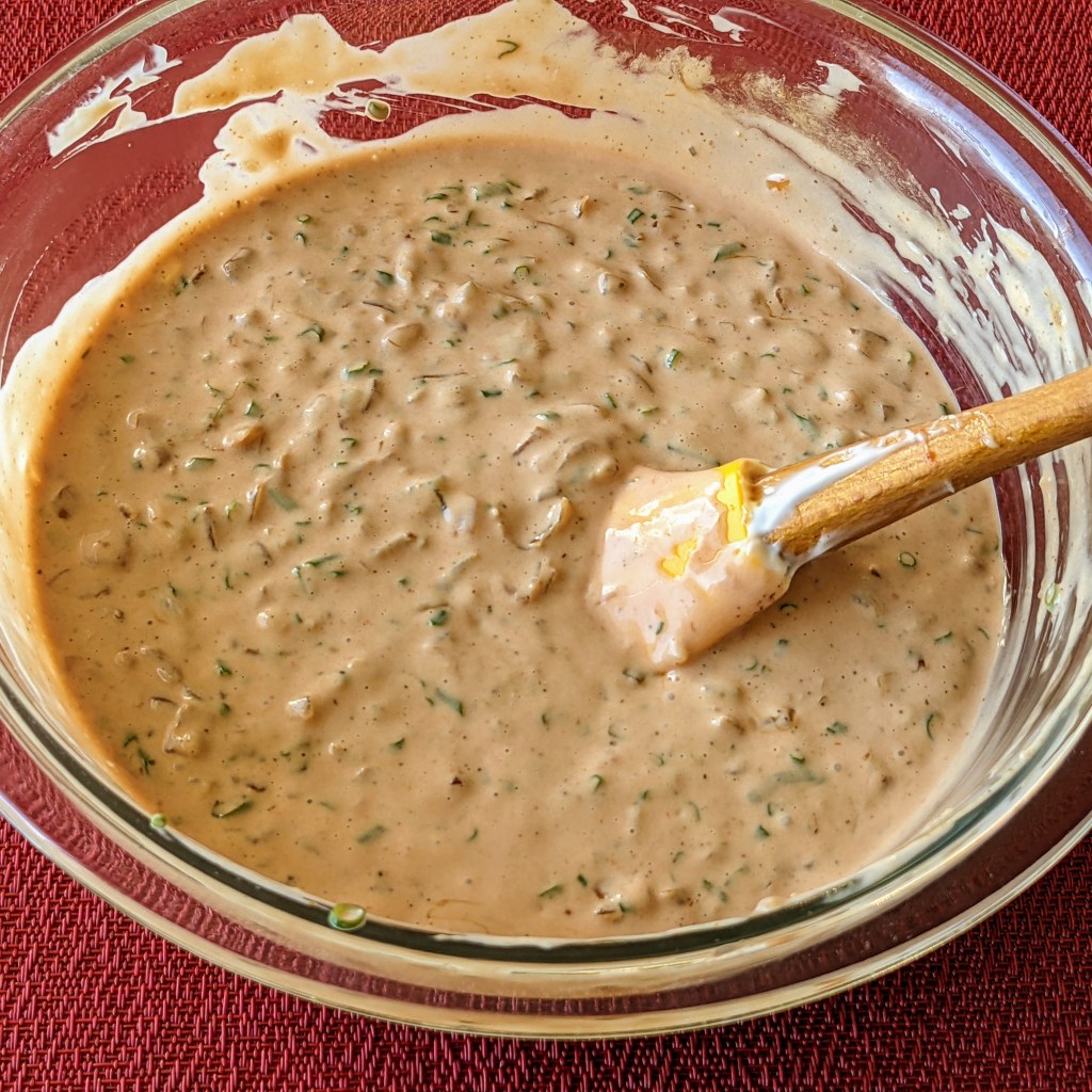 Combine all burger sauce ingredients, including the cooled onion mixture in a medium sized bowl. Use a rubber spatula or a whish to mix all ingredients well. Taste for seasoning.