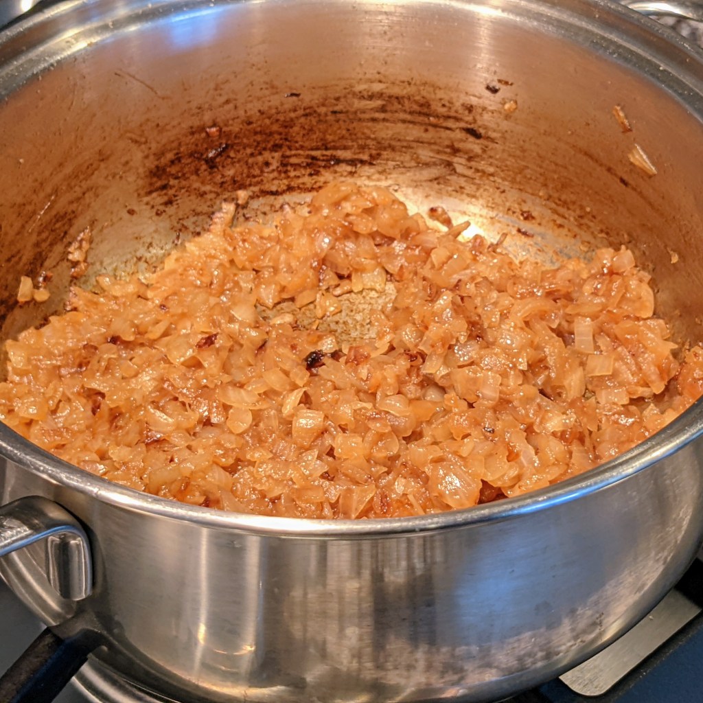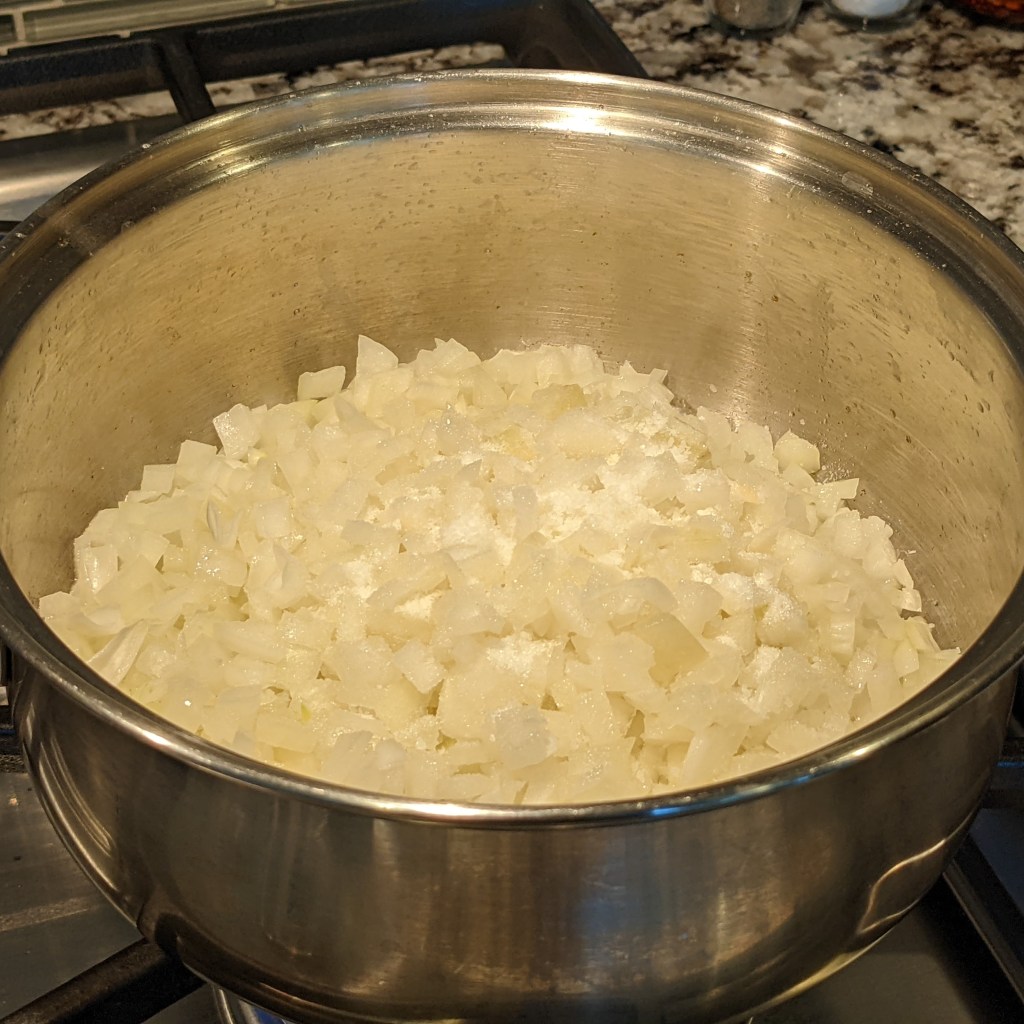 - 2 large or 3 cups yellow onion, peeled, trimmed, and small diced