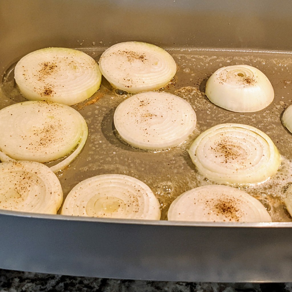 - 2 large yellow onion, peeled, trimmed, cut in to 1/4-inch thick slices