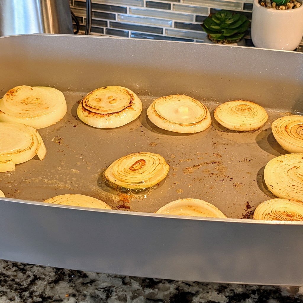 Heat a large non-stick electric skillet or a cast iron skillet over medium high heat. Add 2 tbsp. of unsalted butter. Add onion slices, sprinkle a little bit of salt and pepper over the onion slices.