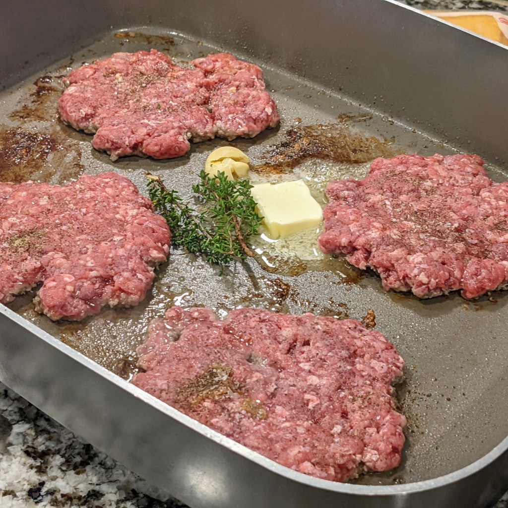 Wipe down the skillet and be careful while wiping down the pan. Add the burger ball (I was able to cook 4 balls at a time) and press it down with a spatula. Add 2 tbsp. butter, 1 smashed garlic cloves, 2-3 pieces of thyme, and baste the burger time to time.