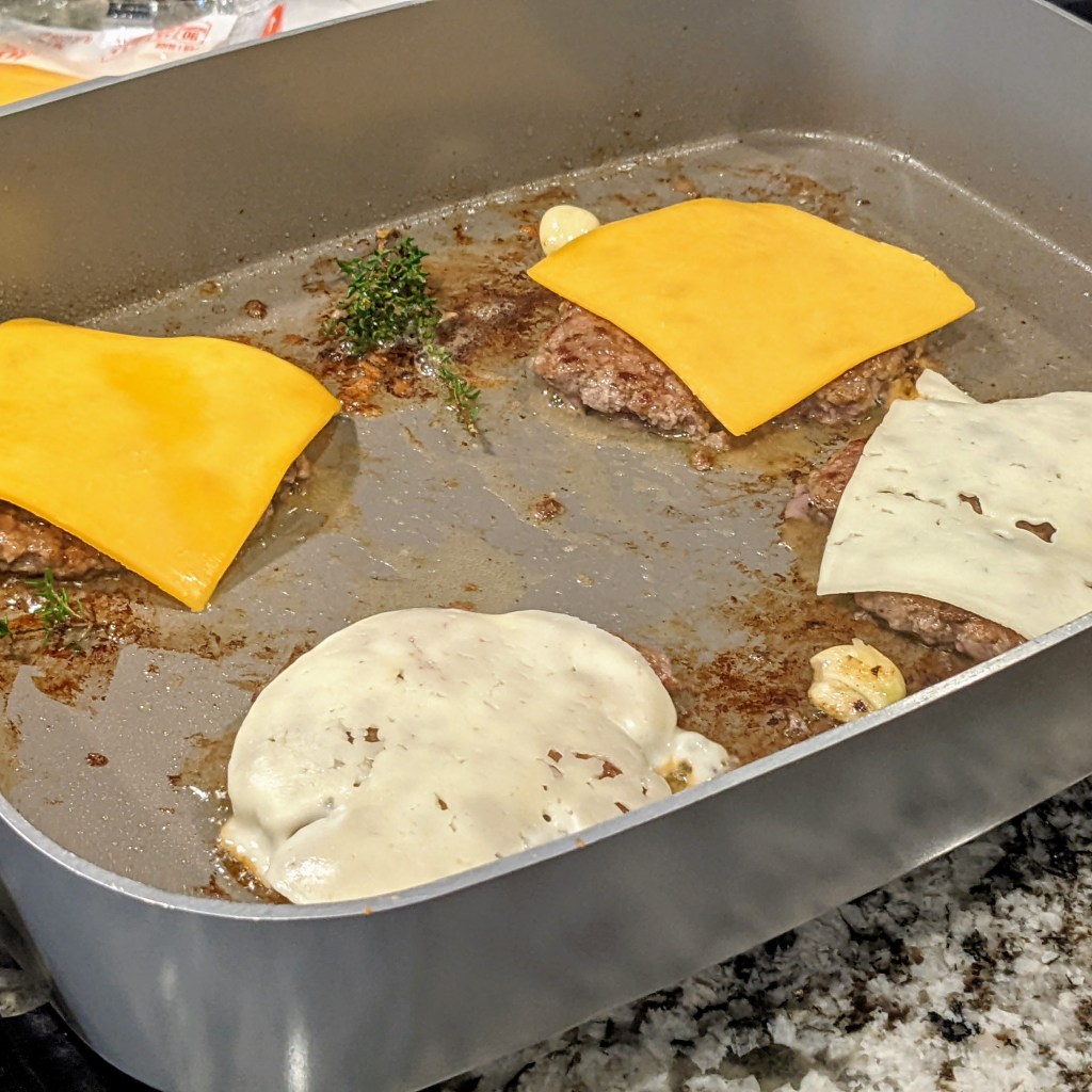 Cook the burger for 2-3 minutes on both sides. Add cheese one slice each on the patty, cover and cook until cheese is melted. Remove the cooked butter to a plate. Wipe down the pan with a paper towel. Repeat with the remaining burger.