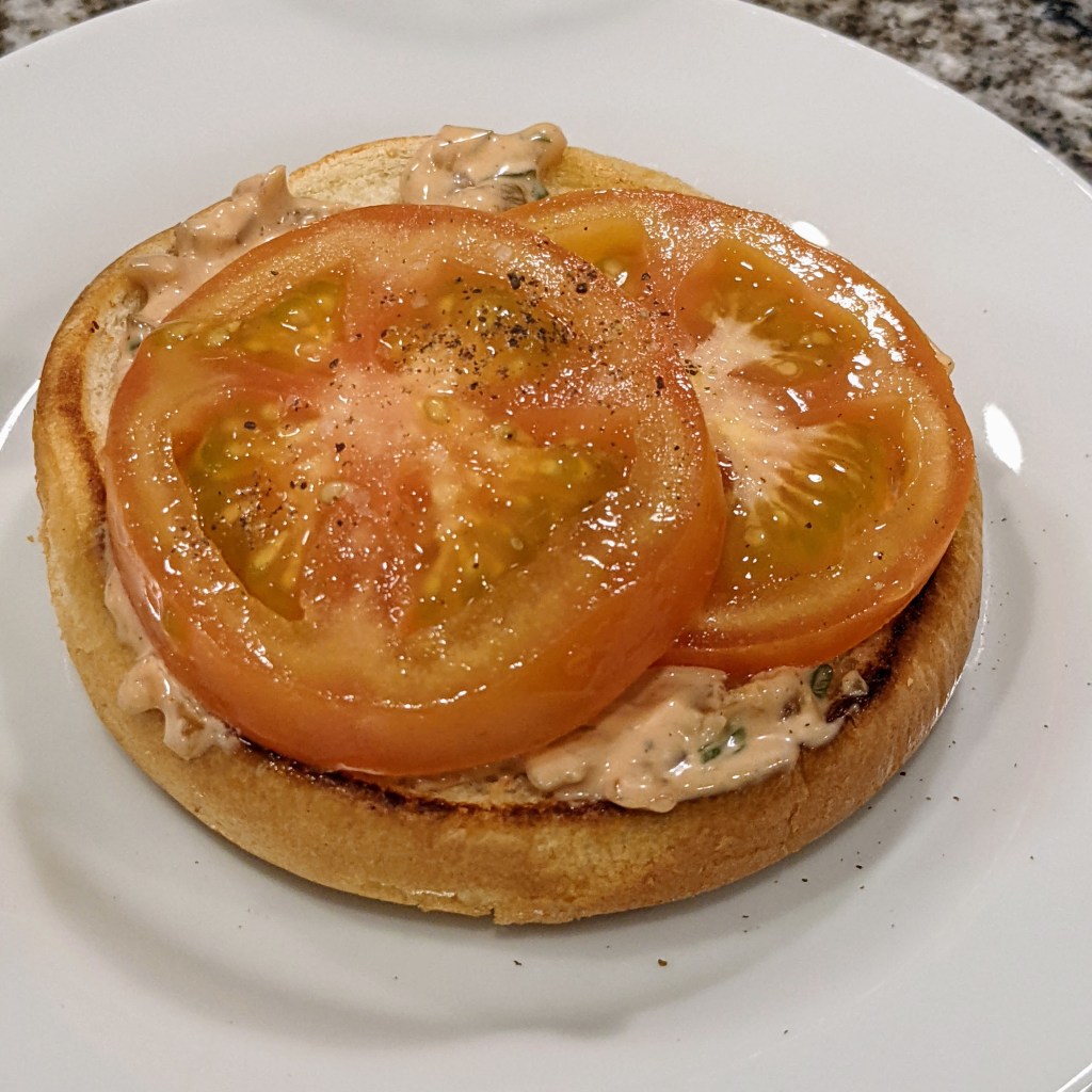 Spread a generous amount of burger sauce to both buns. Add sliced tomatoes (make sure to season the tomatoes with a little salt and pepper), burger patty, and a few pieces of lettuce slices on the bottom bun.