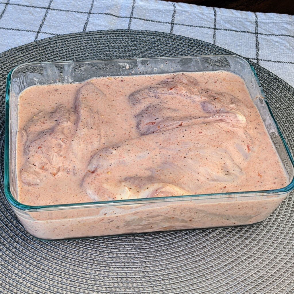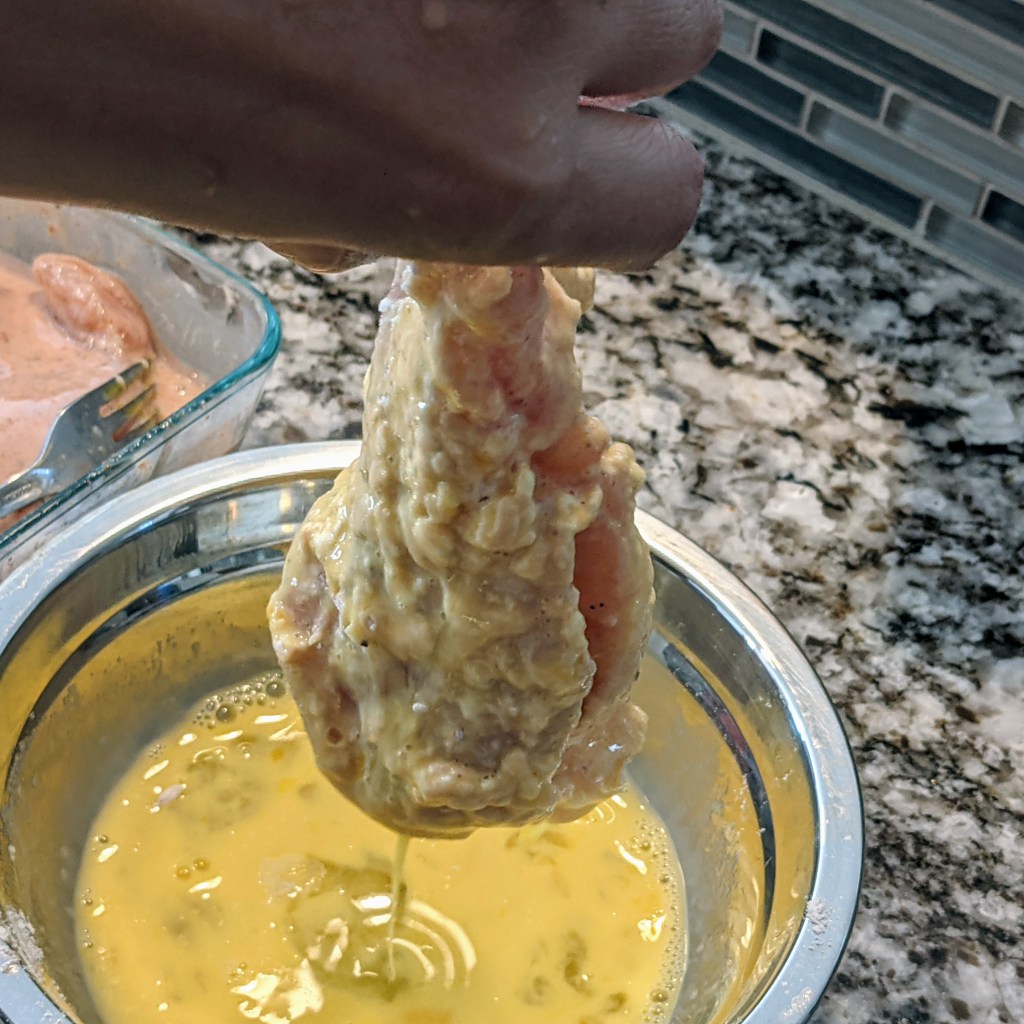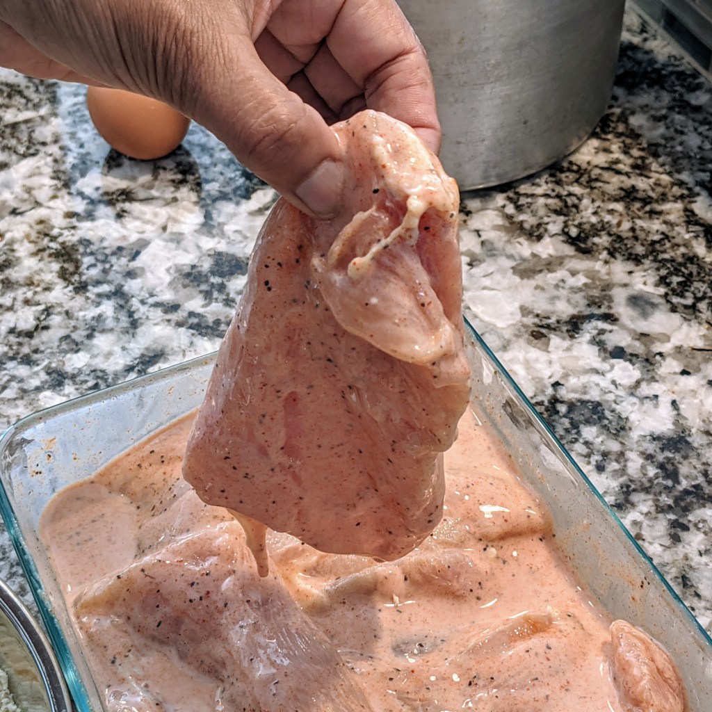 Thoroughly whisk all marinade ingredients, except for the chicken, in a large rectangle casserole dish. Add chicken pieces to the mix. Cover and place in the fridge to marinate overnight or at least 4 hours covered in the refrigerator. Bring the chicken out of the refrigerator an hour before you are ready to fry.