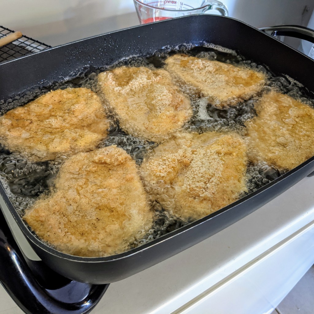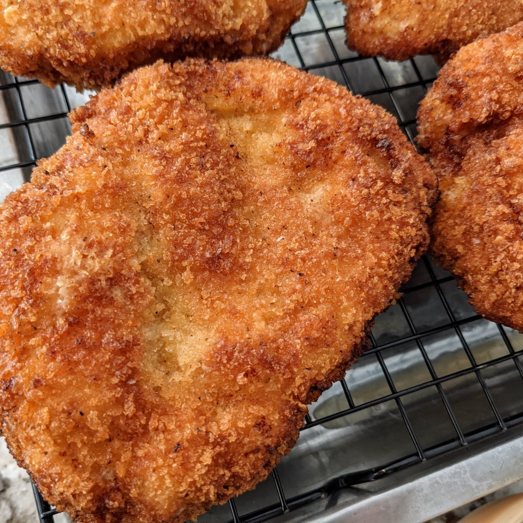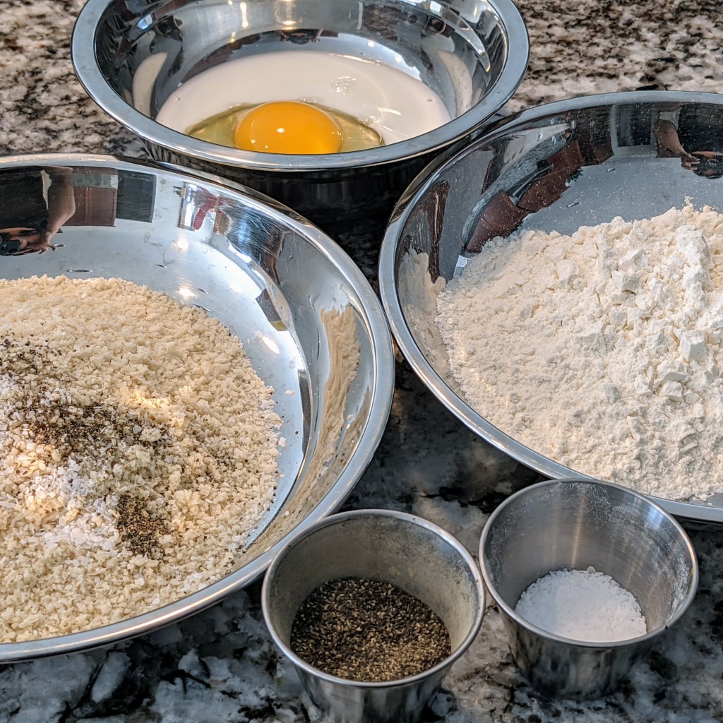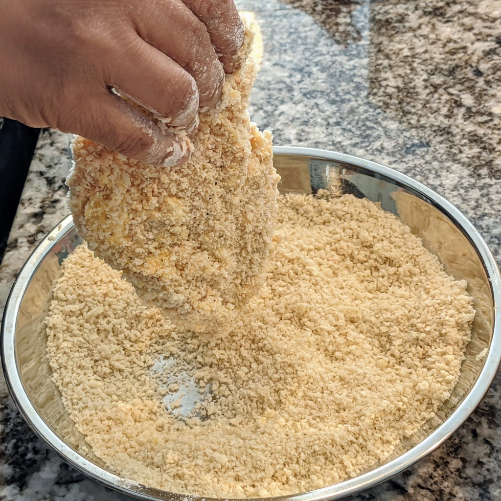 Dredge each piece of chicken in flour, then egg, and the panko mixture. Repeat until all chicken is coated in breading.