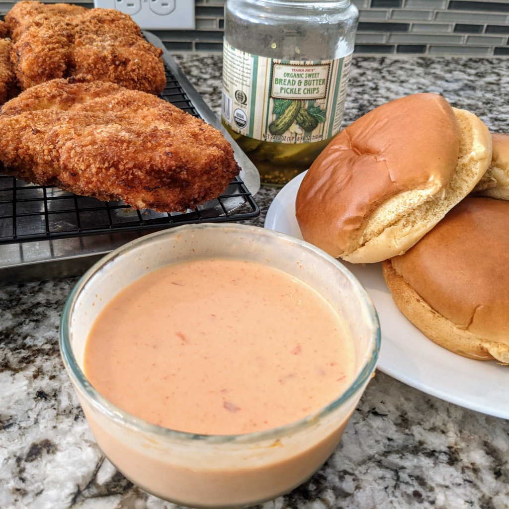 I found a lot variations of bang bang chicken, with most of the recipes being deep fried or stir-fried with veggies. We love fried chicken sandwiches at our house, so I decided to create a sandwich recipe version of bang bang chicken; I didn’t see anything quite like this online.