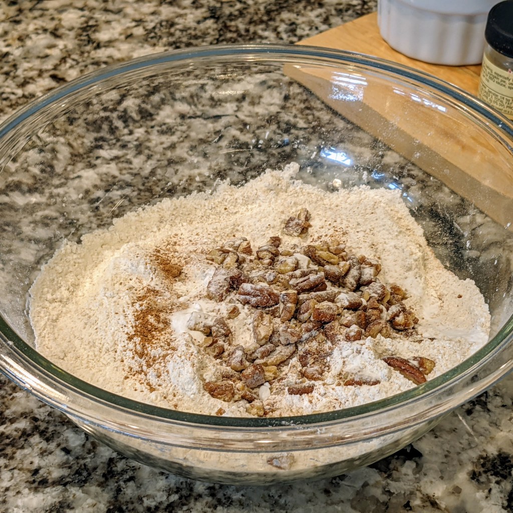Mix flour, baking soda, nutmeg, brown sugar, and pecans in a medium size bowl.