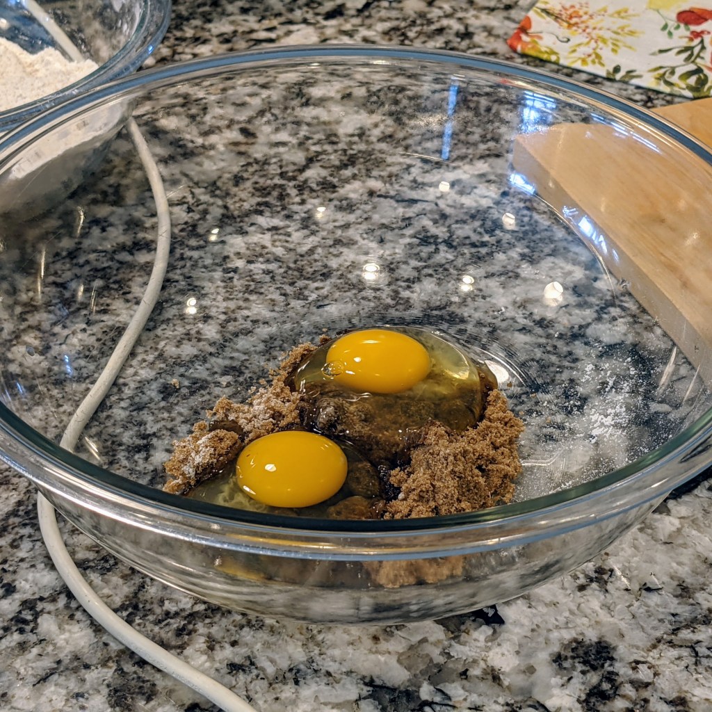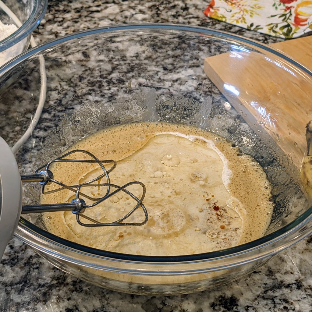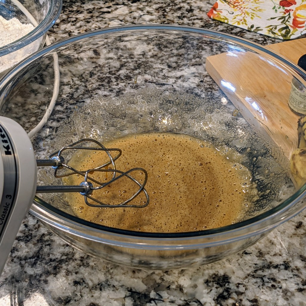 In another large mixing bowl cream eggs and sugar with an electric handheld mixer.