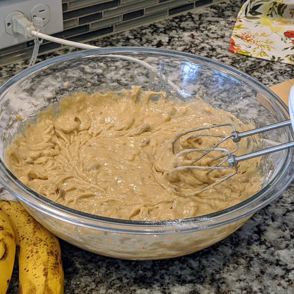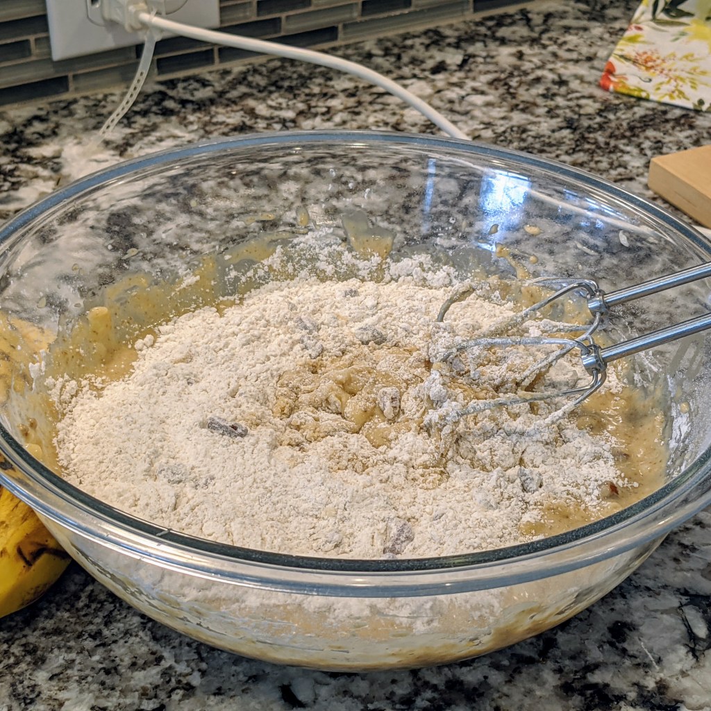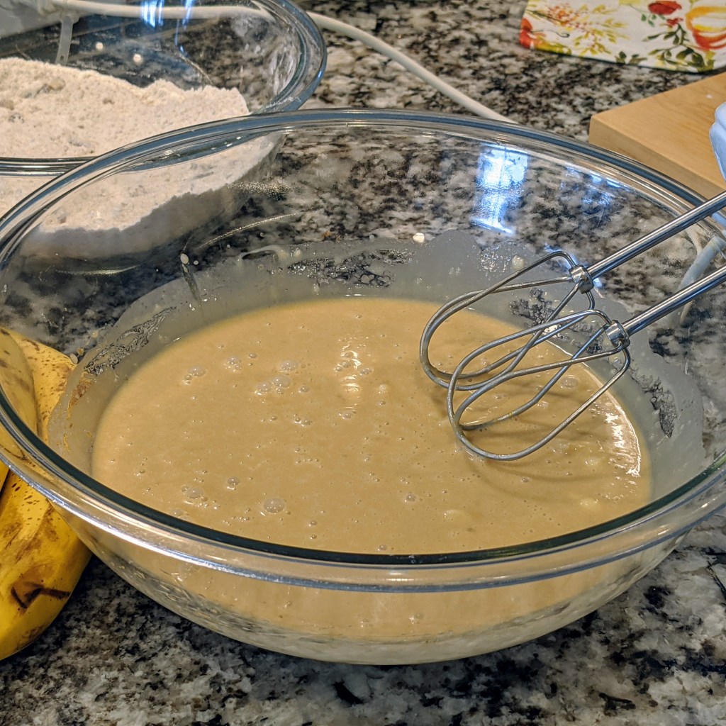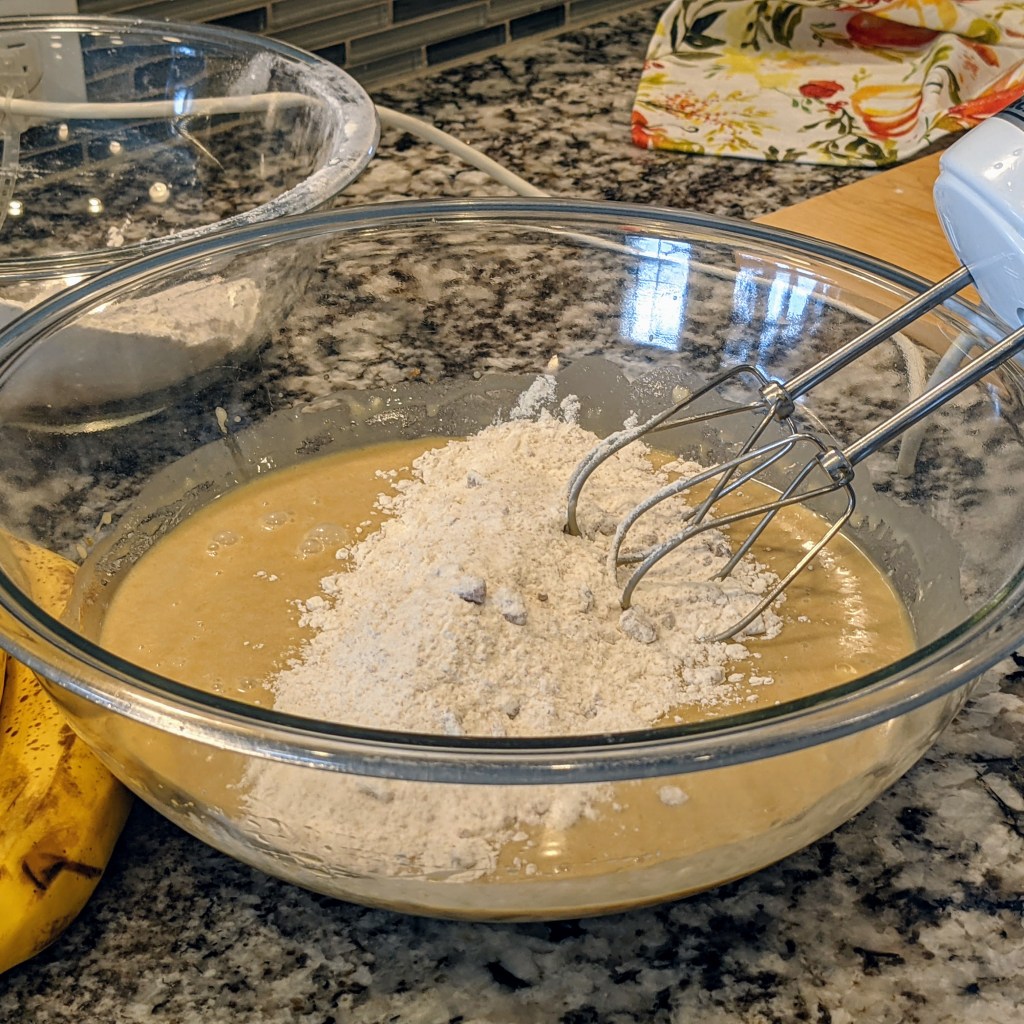 Slowly incorporate flour mixture to the wet mixture in couple of batches. Mix in the mashed bananas to make a smooth batter. Don’t over mix the batter.