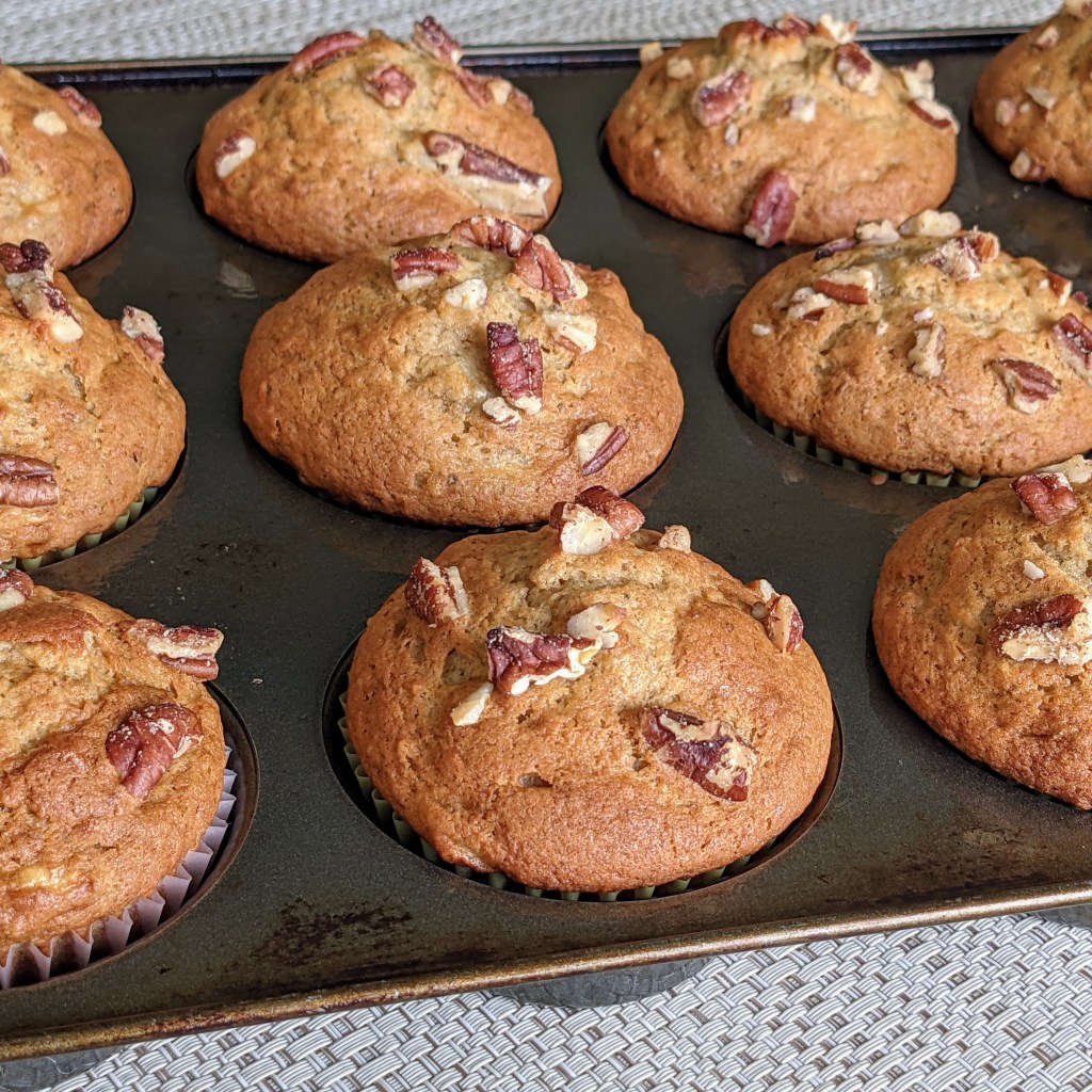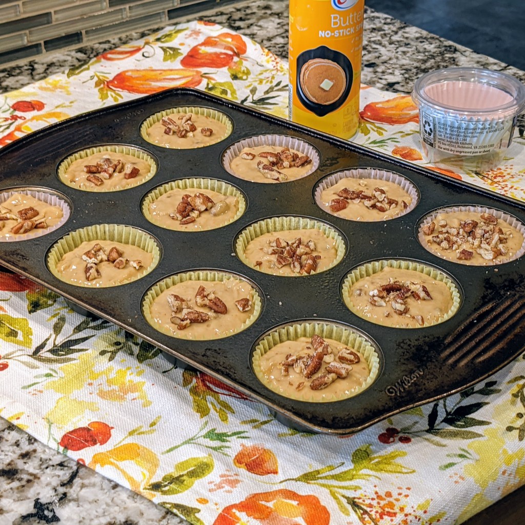 Spoon the batter evenly into the prepared muffins cups. Sprinkle some of the extra chopped pecan over the top of the muffin. Shown in the picture below. Bake the muffins in preheated oven for 18-20 minutes, or until a toothpick inserted into the center of a muffin comes out clean.