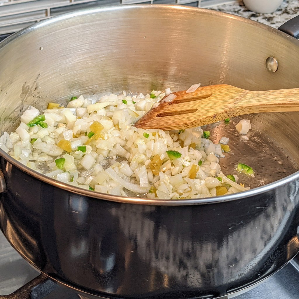 Heat oil in a large heavy bottom sauce pan over medium- high heat. Add onion, garlic, jalapeno, and canned chili. Cook for 2-3 minutes, or until onions are soft.