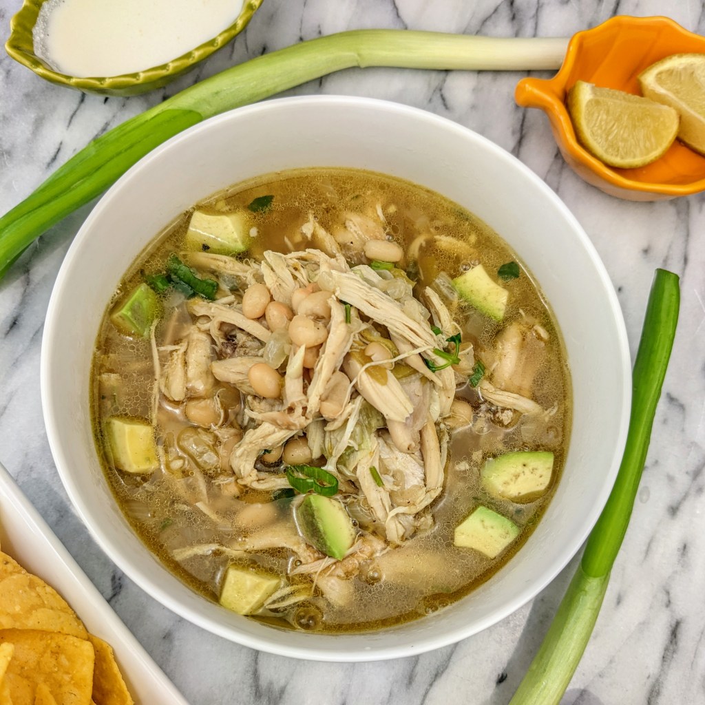 The chili has tender pieces of rotisserie chicken, white beans, and aromatic spices like cumin and coriander. The broth is rich and has a hint of lime flavor.