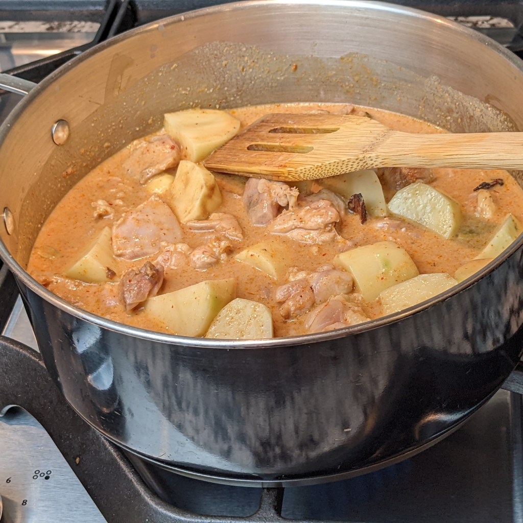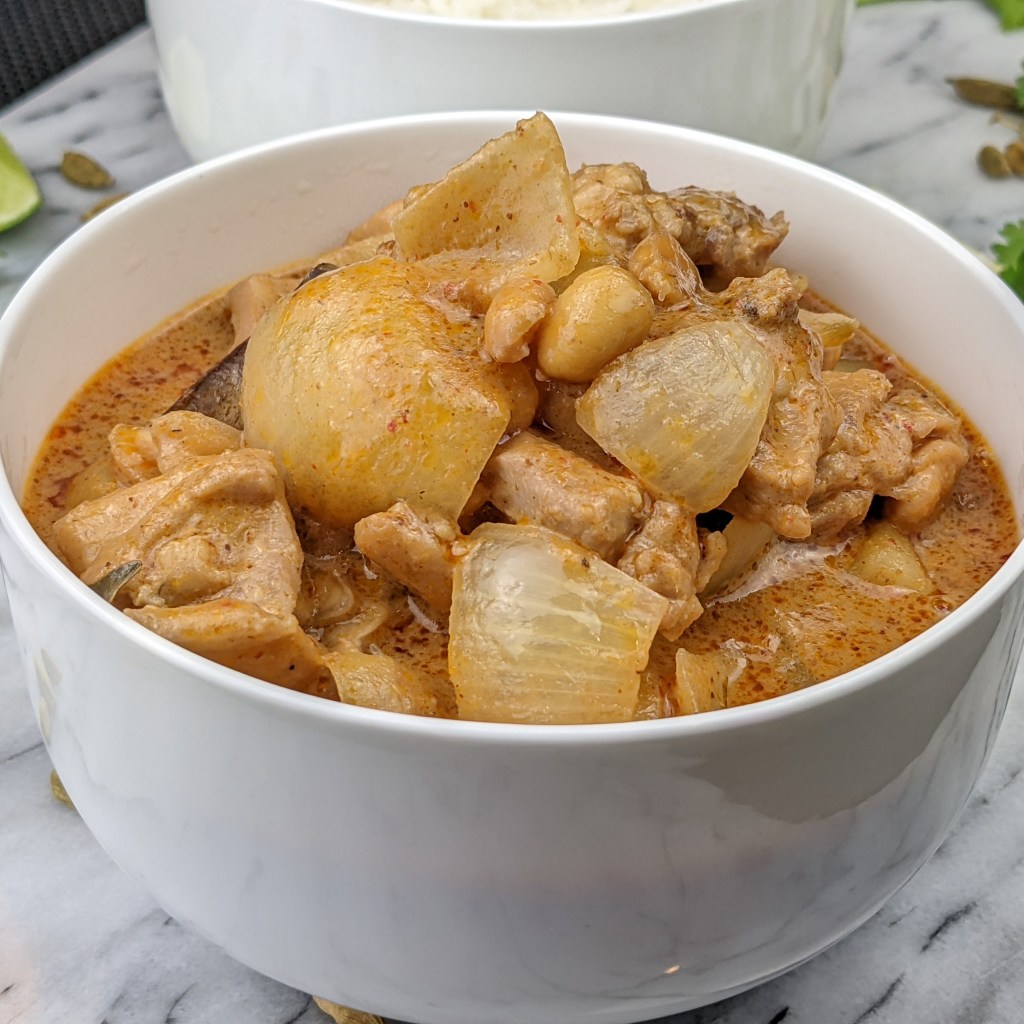Today I will be sharing my version of massaman chicken curry with you. It has boneless, skinless chicken thighs with potatoes and onions in a savory fragrant sauce.