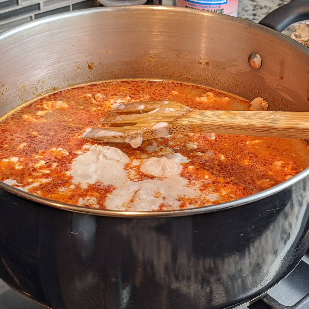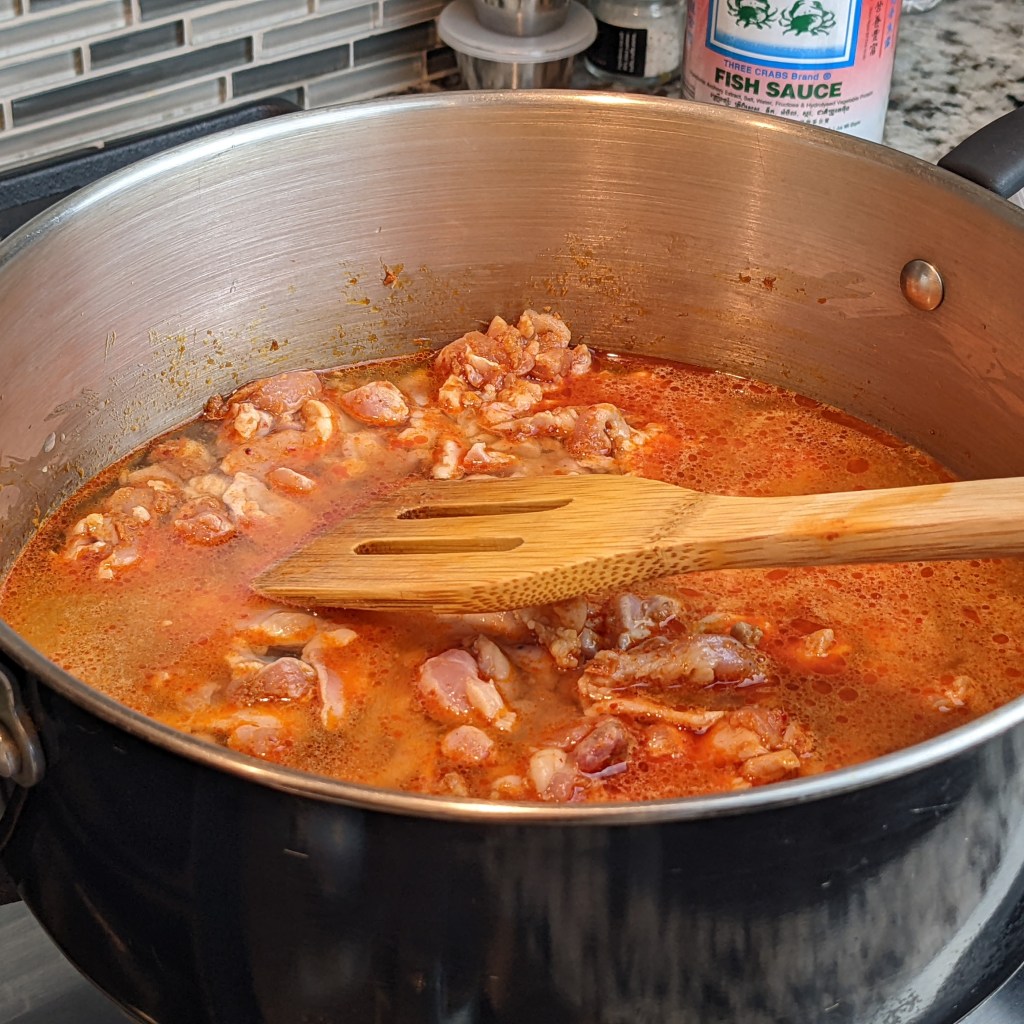 Heat oil in a large soup pot over medium-high heat. Add curry paste, stir well, then cook for about a minute. Add chicken, stir well, then cook for 2-3 minutes. Add 3 cups water, stir well.