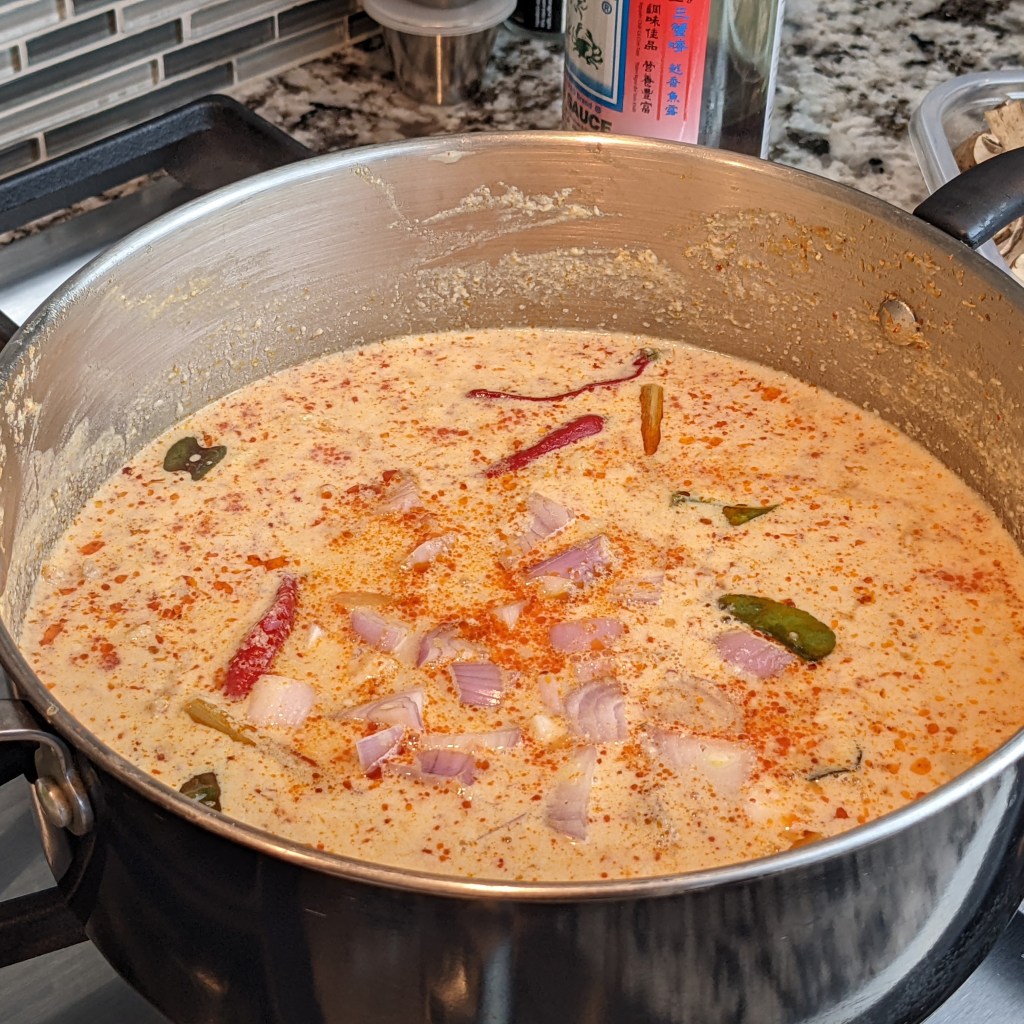 Add coconut milk, stir well, add chicken base, lime leaves, lemon grass, chilies, ginger, then stir well. Add shallots, cover and cook for 2 minutes.