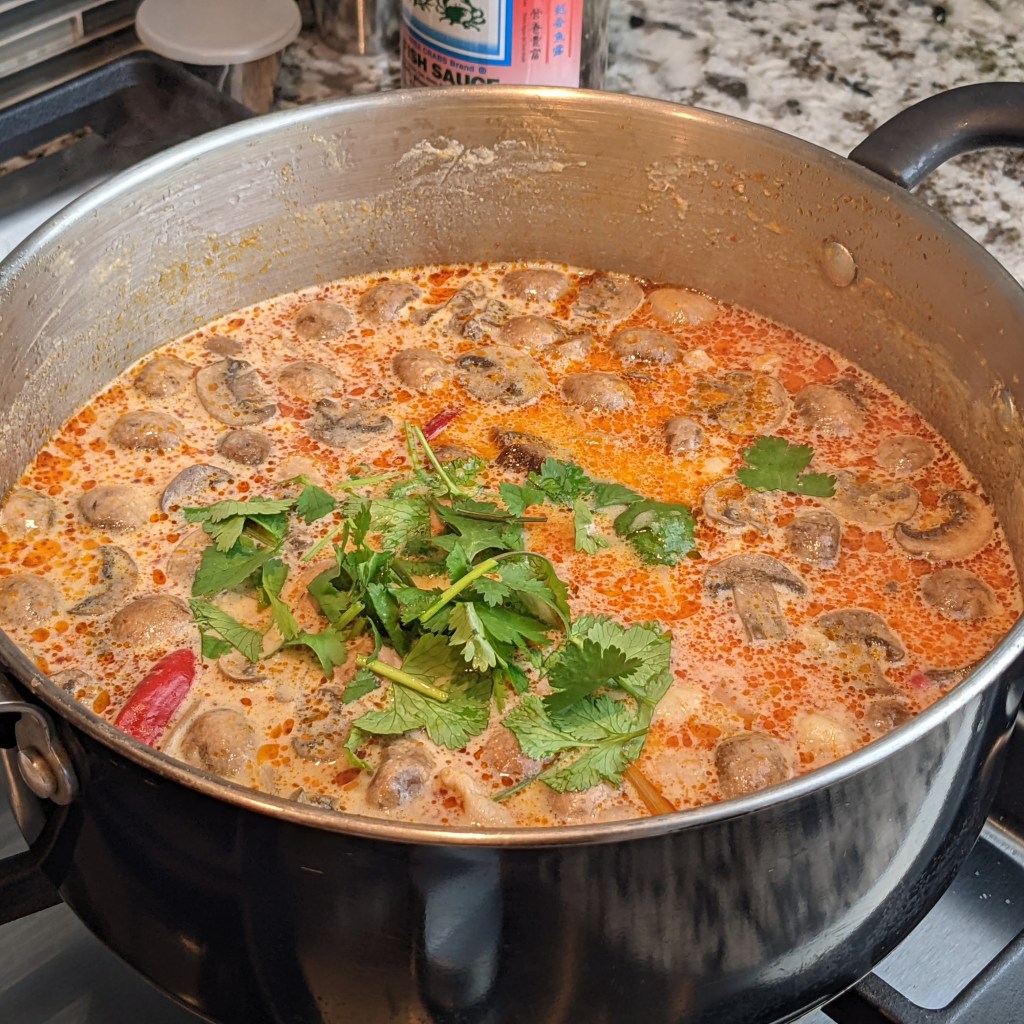 Add mushrooms, sugar, fish sauce, and lime juice. Cover and cook for 3 minutes or until the chicken is cooked through. Check for seasoning. Add 1/8 tsp. salt if needed. Stir in cilantro leaves. Turn off the stove. Remove ginger, lemon grass, lime leaves, and whole chilies before serving.