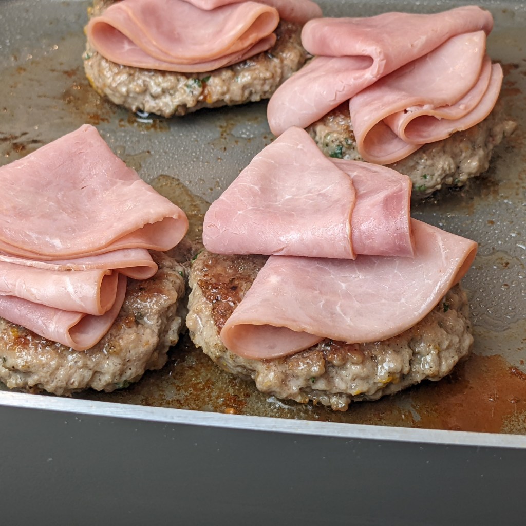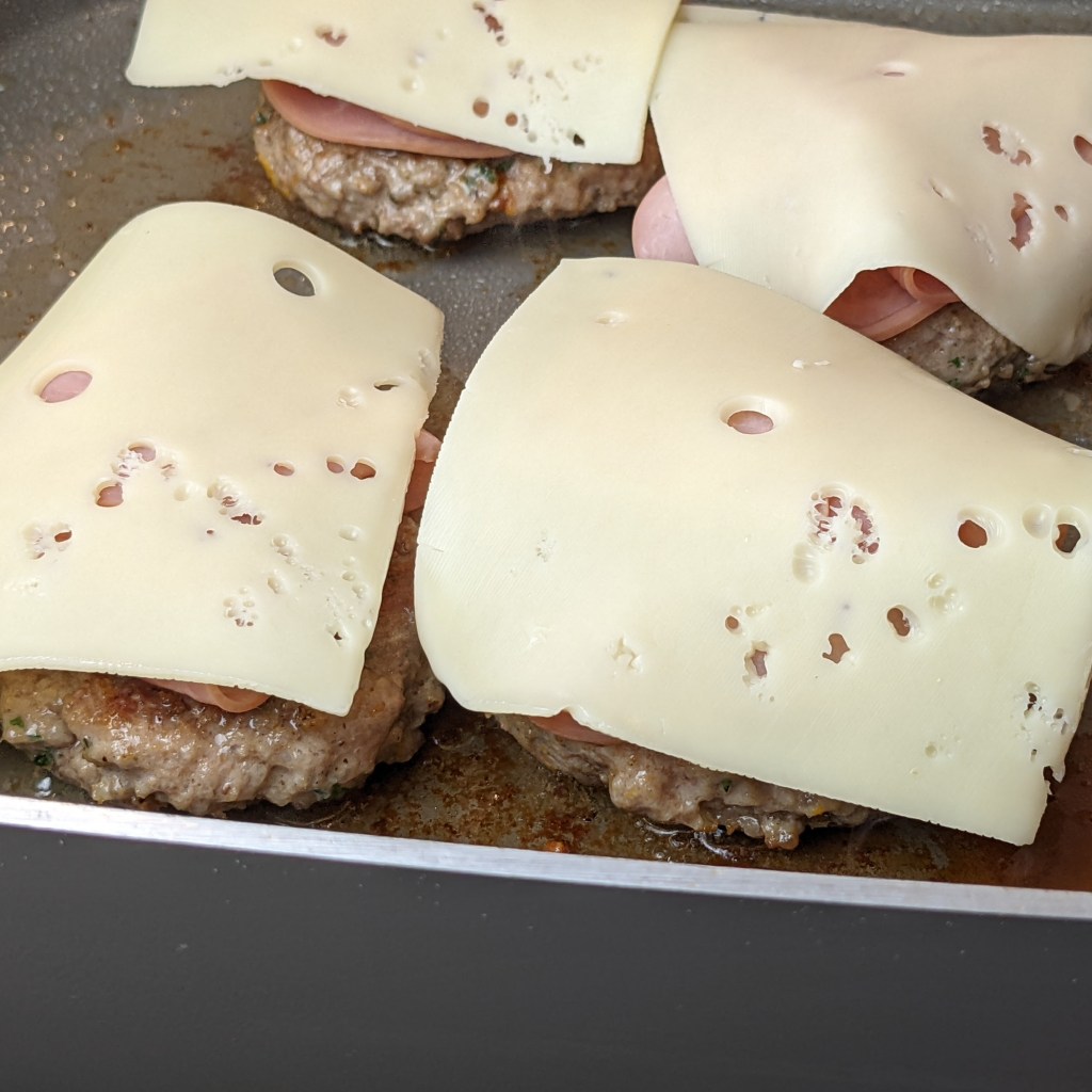 During the last minute of cooking time top each burger with 2 pieces of ham, then top with cheese. Cook the burger until the cheese is melted.
