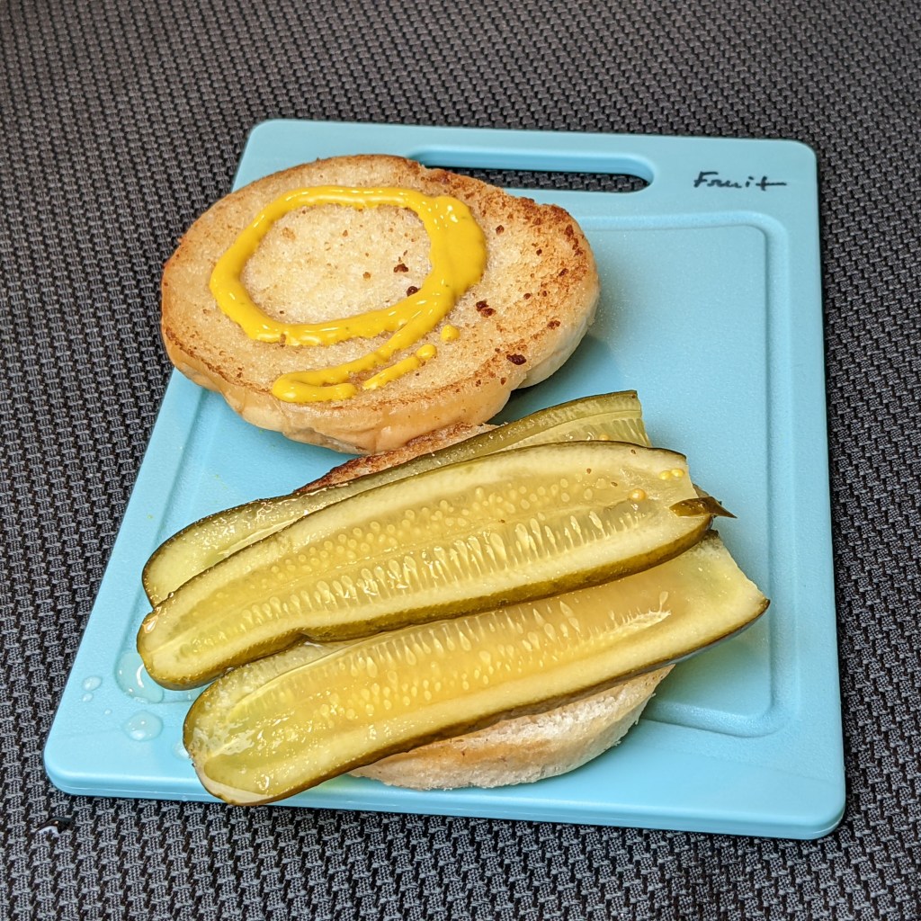 Once you are ready to assemble the burger, spread a thin layer of mustard on both cut sides of the bun. Place pickle slices (trim pickles to fit the bun) on the bottom bun, burger, then finish with the top bun.